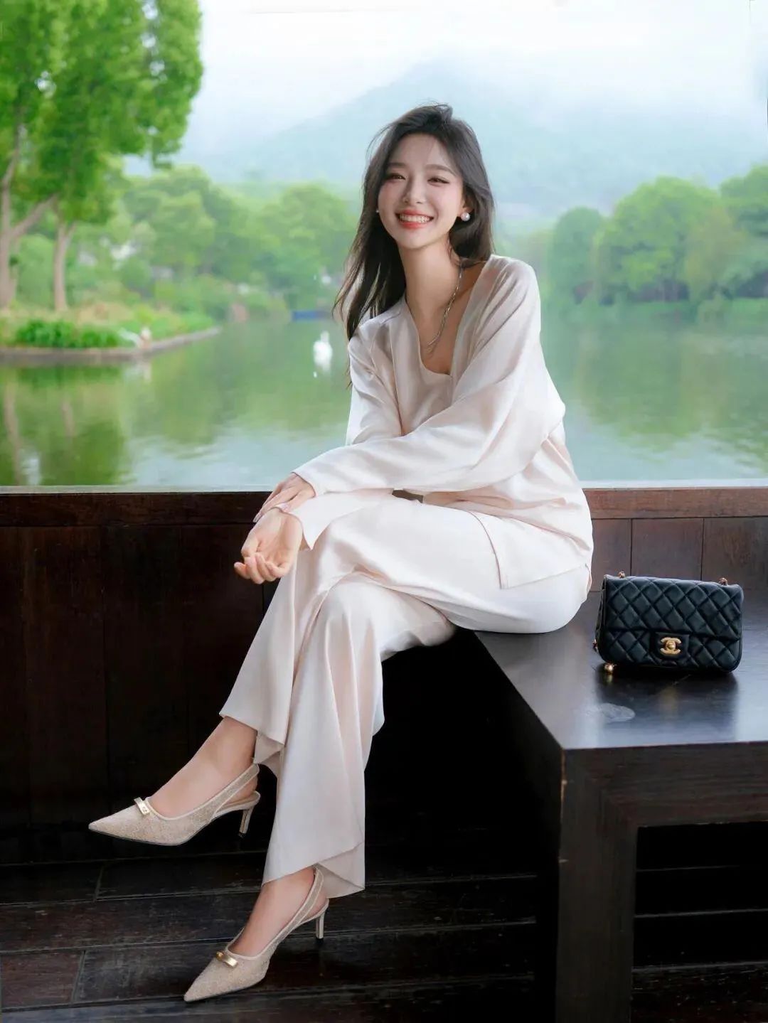 双腿优雅交叠坐于船内,双手轻轻交握放在腿上,阴雨天的湖景透过窗户成为背景,身旁的黑色包包点缀出精致感。这个姿势传递出一种闲适从容的气质,成片效果仿佛在享受阴雨天独有的宁静时光。