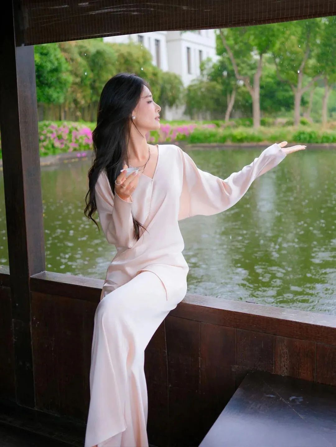 坐在船里,一手拿着杯子,另一只手伸展指向窗外的雨景,阴雨天的湖水、绿植,构成了一幅诗意的画面。这个姿势像是在与阴雨天互动,拍出来的照片充满了文艺气息。