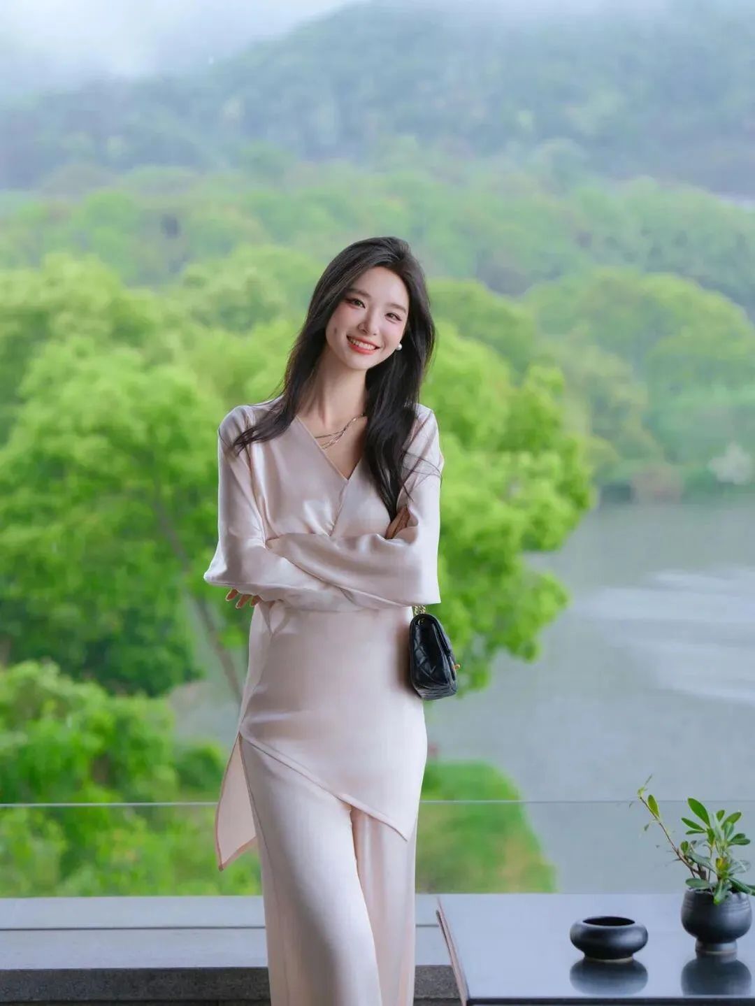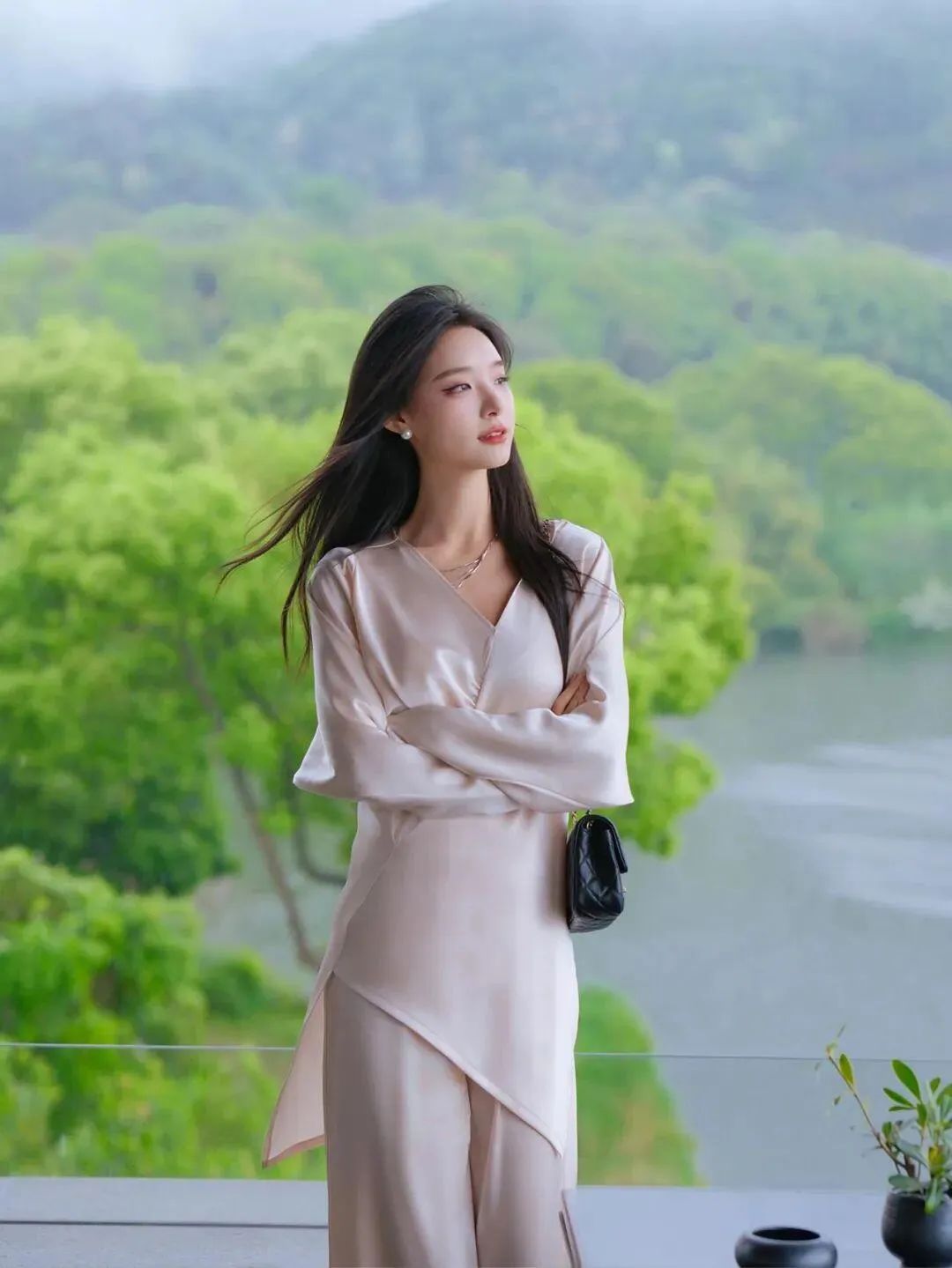 双臂交叉于胸前,身姿挺拔站在湖畔边。背景是阴雨天里郁郁葱葱的山林和湖水,整体画面宁静悠远。交叉手臂的姿势,既显端庄又能展现自信,与阴雨天的静谧氛围相得益彰。