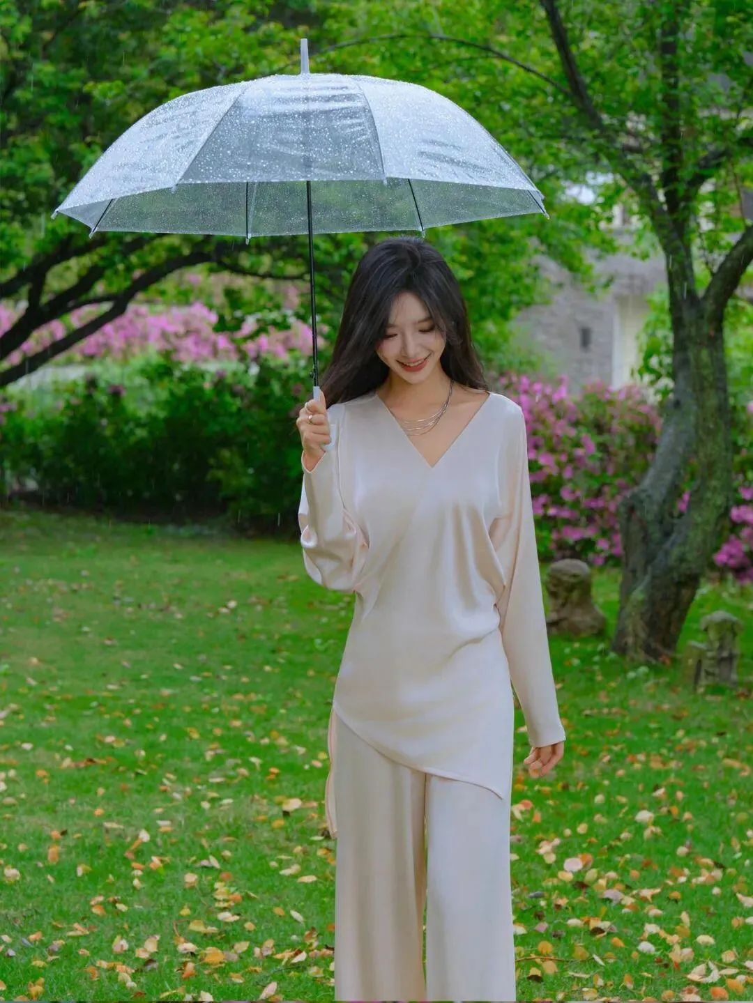 撑伞站立在草地上,一只手插在口袋,姿态随意又自在。阴雨天的背景让画面富有层次感,展现出一种随性的优雅,拍出来的照片优雅知性又迷人,搭配甜美的笑容让人忍不住多看几眼。