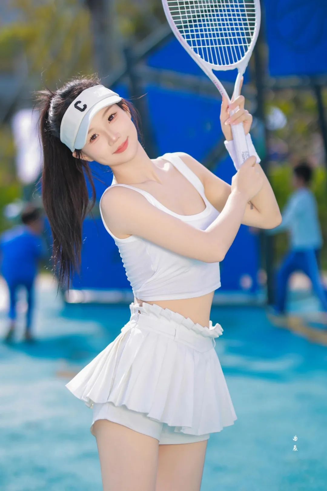 双臂交叉,将网球拍轻轻靠在手臂上,微微弯腰,身体向前倾,脸上带着娇俏的笑容,眼神明亮又灵动。这个姿势既展现了少女的甜美可爱,又透露出一丝运动后的小俏皮。