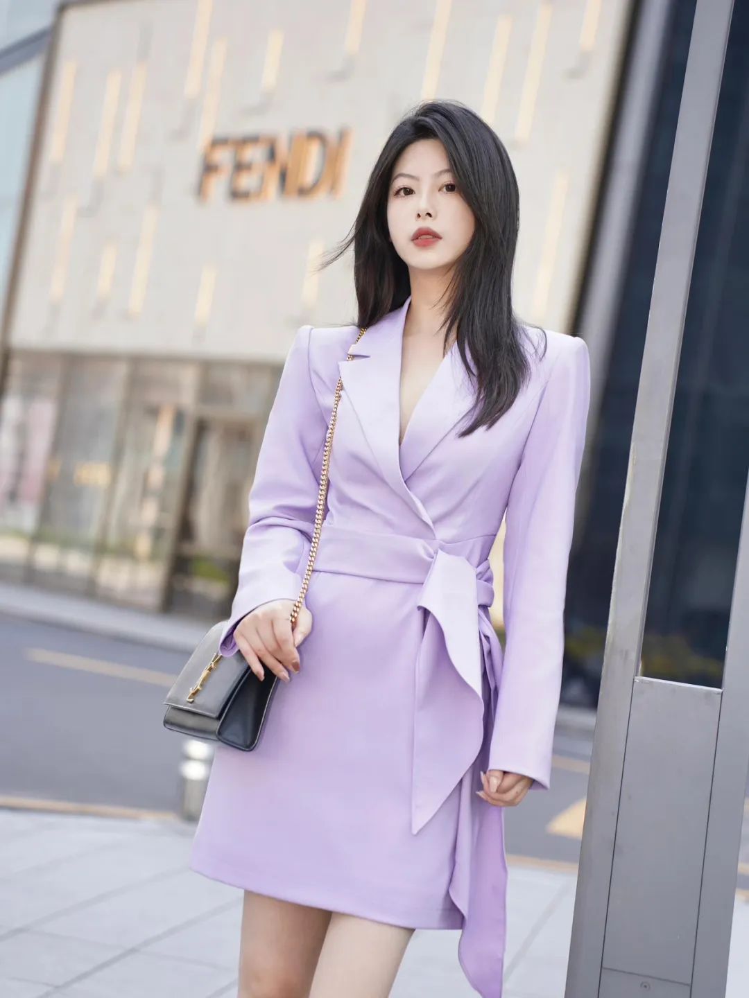 靠在墙边,正面直视镜头,一手插兜,一手拎包,身体微微放松又不失挺拔。这个姿势展现出一种大气从容的气场,简单的姿势却能突出服装的版型和自身的时尚感,拍出来的照片大气好看又自然。