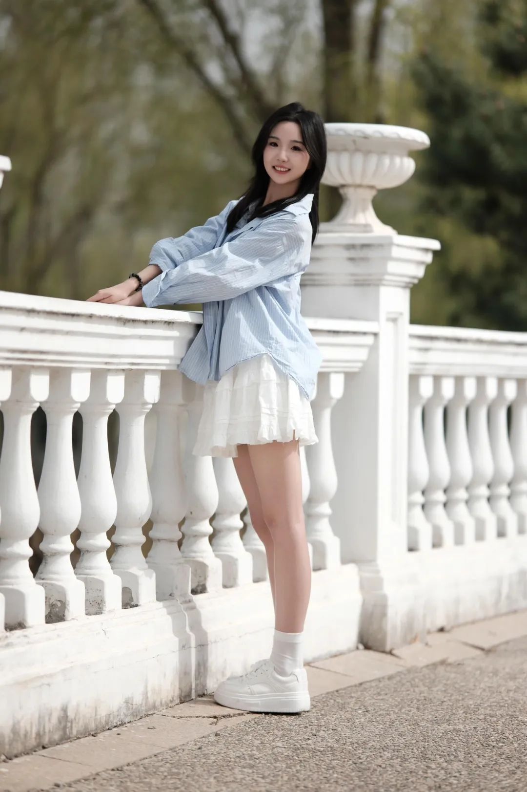 倚靠在白色栏杆上,身体前倾微微歪头,眼神专注又温柔地看向镜头。这个简单的姿势与人物的清新穿搭相呼应,营造出岁月静好的氛围,拍出来的照片温柔恬静。