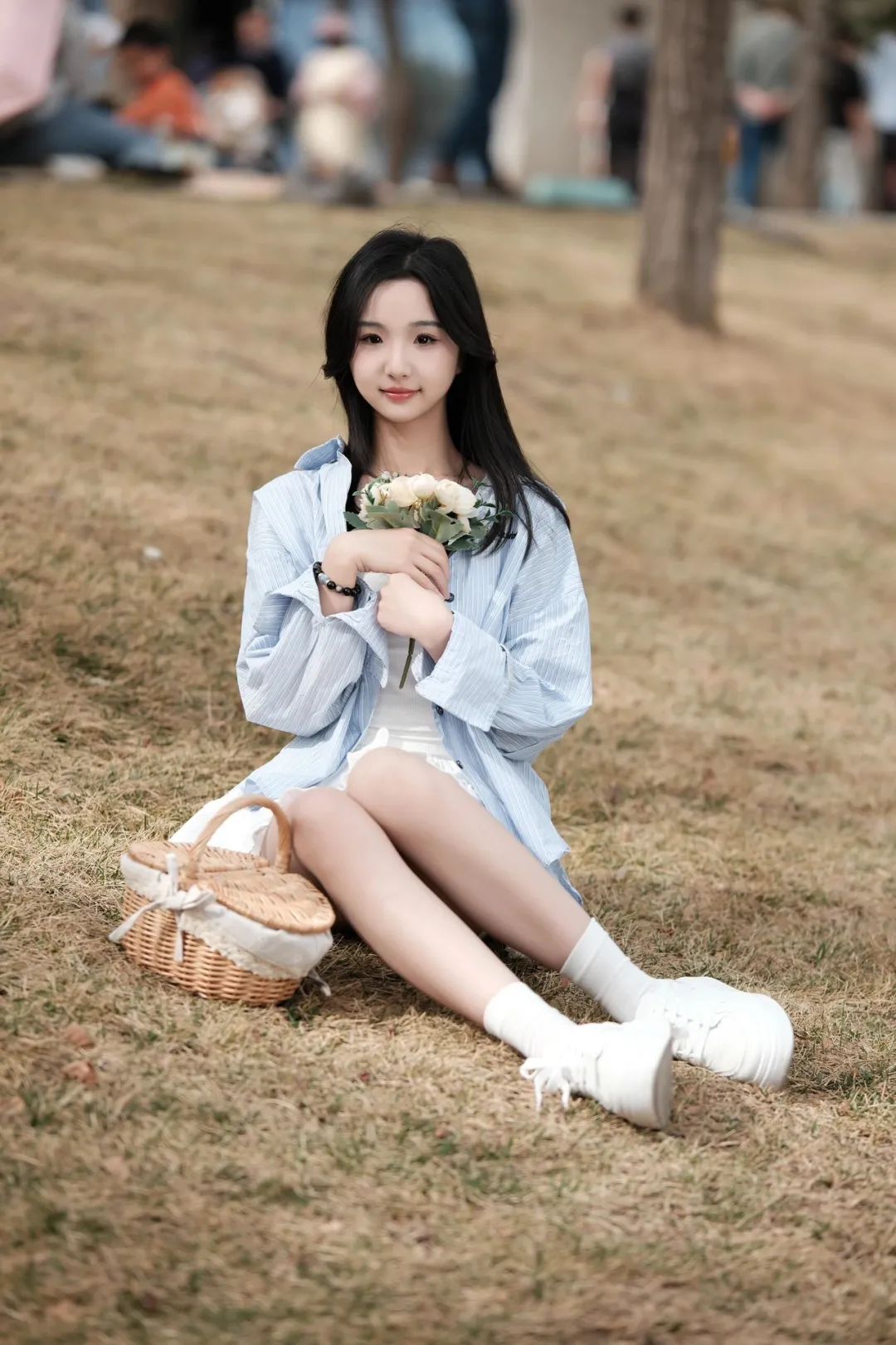 侧身坐在草地上,手持花束置于胸前,另一手轻触地面,微微抿嘴,回头看镜头。这个姿态优雅,仿佛在享受春日的静谧时光,拍出来的照片优雅迷人,出片漂亮。