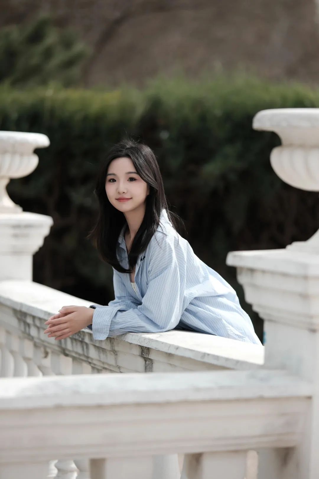 侧身倚靠着栏杆,双手搭在栏杆上,挺直腰背,脸上挂着淡淡的微笑,看向镜头。这个姿势勾勒出人物的优美身姿,展现出青春的自信风采,拍出来的照片清新唯美又自然。
