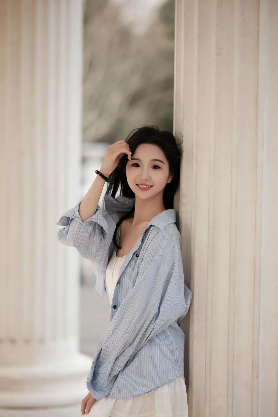 侧身站立背靠柱子,一手撩起发丝,微微歪头,露出灿烂的笑容看向镜头。简单的动作,却将俏皮可爱的感觉展现得淋漓尽致,拍出来的照片给人一种灵动活泼的印象。