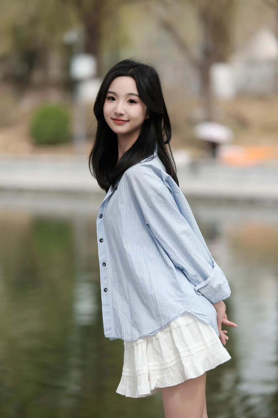 微微敞开衬衫,内搭白色打底,女孩歪着头,一手随意摆动,另一手轻轻扶着衣角。自然的动作和清新的穿搭,让时尚感与清新感完美融合,这个姿势不仅自然不做作,还能突出人物的气质与温柔。