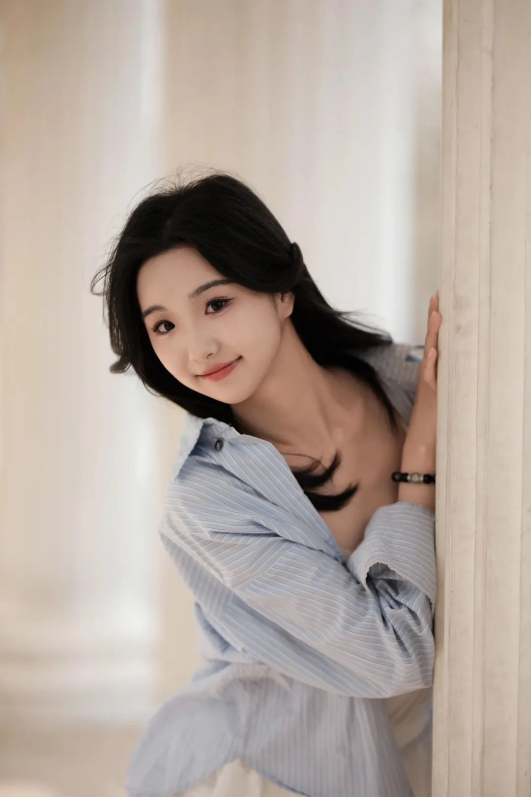 一手扶着柱子,身体微微前倾,浅浅微笑看镜头,眼神中带着一丝深情。这个姿势营造出含蓄而深情的氛围,能让照片显得更加唯美,同时也能突出人物的优雅气质,意境自然又好看。