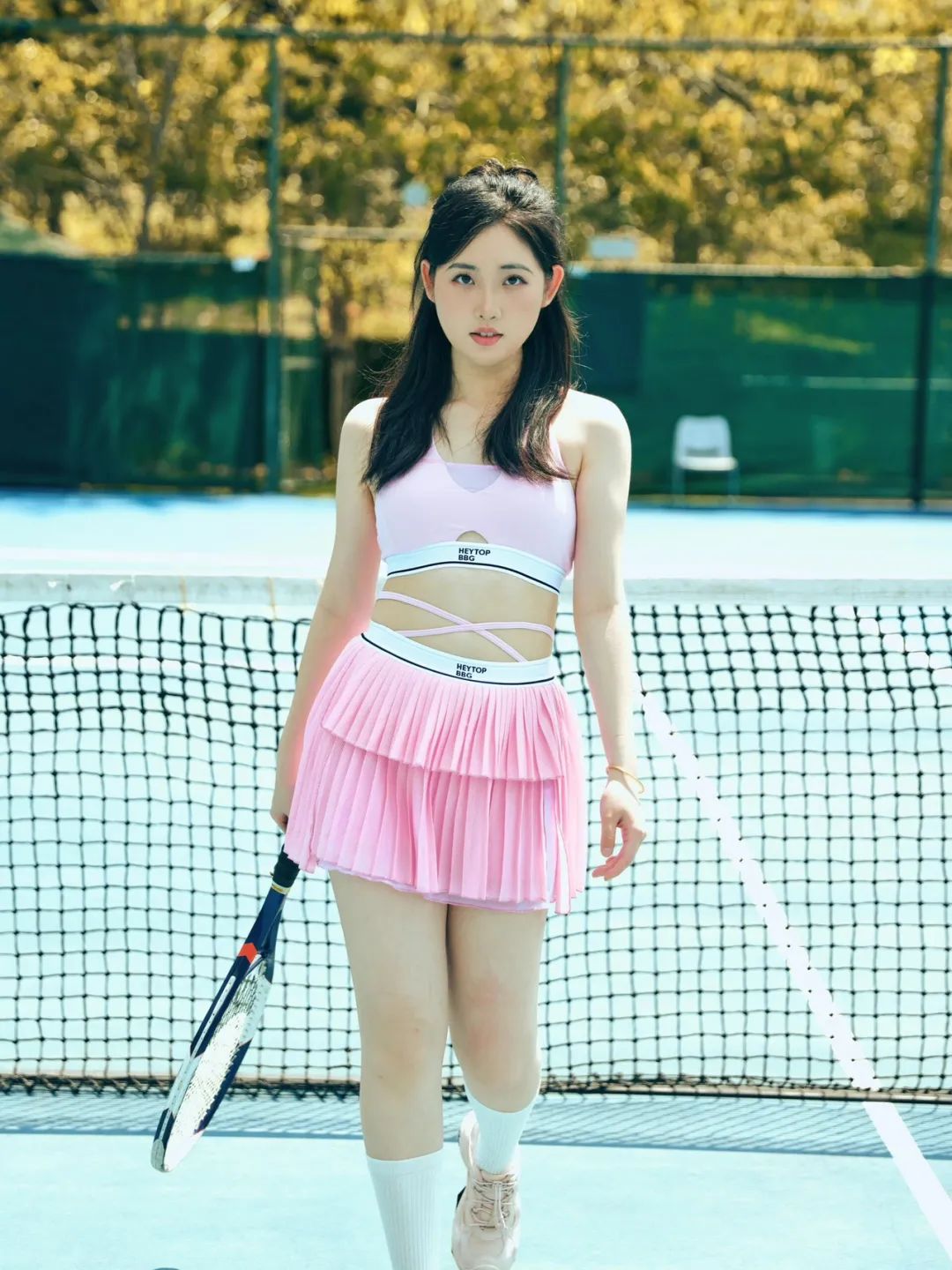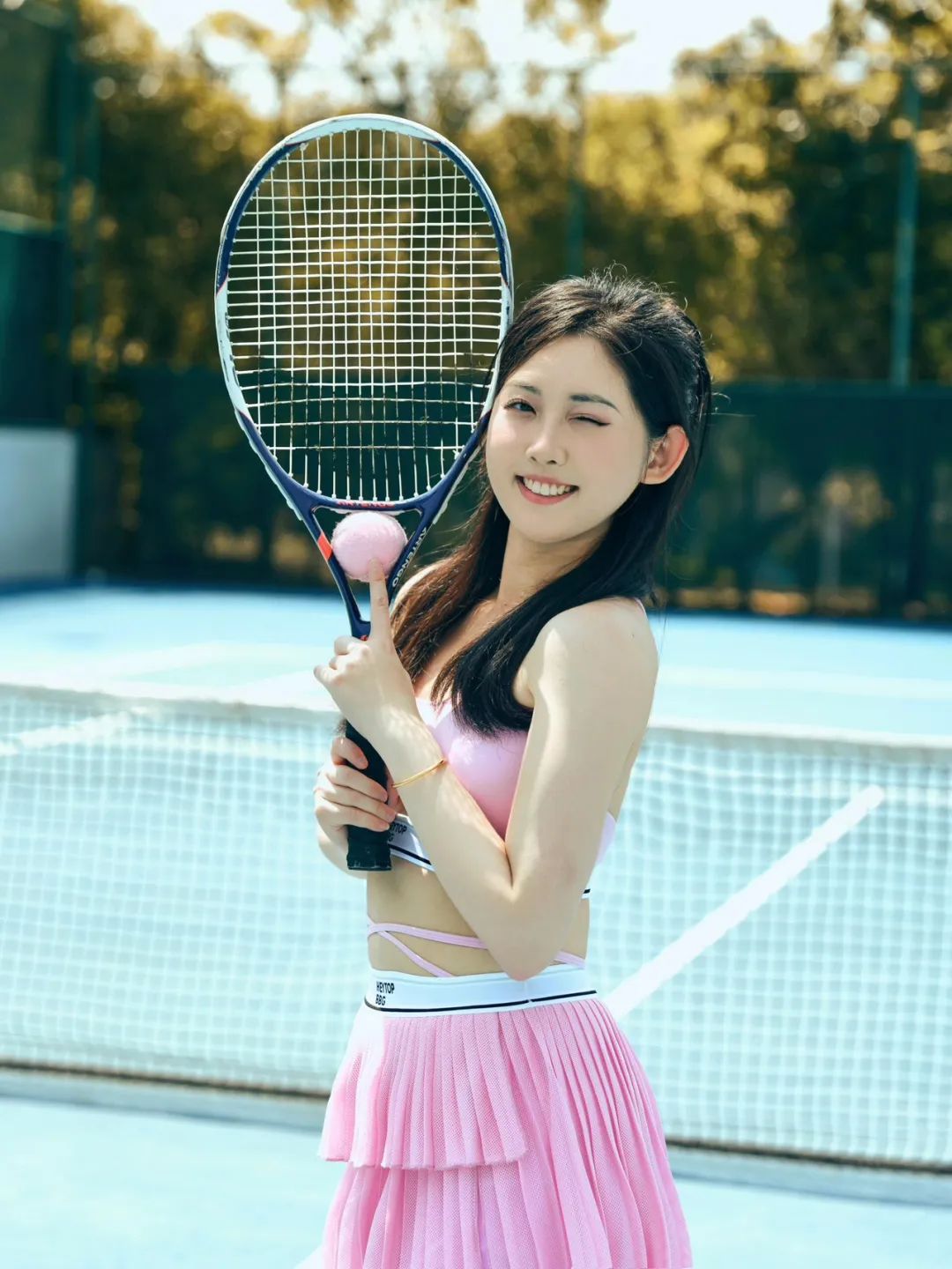 侧身站立,手持网球拍,将其倾斜着半遮住脸庞,一只眼睛俏皮地眨动,嘴角勾起一抹笑意。这种略带羞涩又灵动的姿势,为照片增添了几分俏皮可爱的感觉。