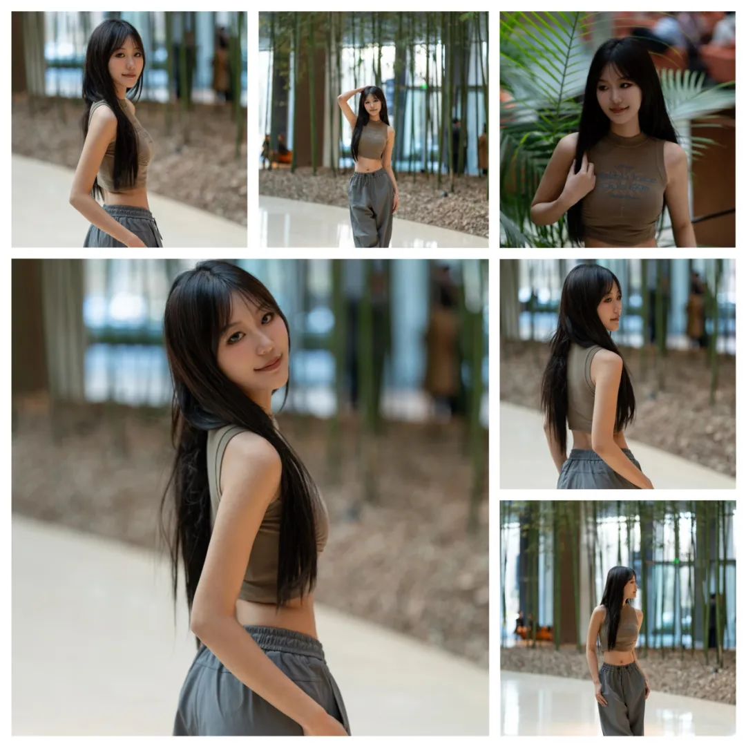 侧身而立,一手自然下垂,另一手轻触裤兜,微微转头,面带微笑,眼神明亮而温柔的看向镜头。身着简约的短款无袖上衣与宽松长裤,在竹林背景的衬托下,显得格外清新,成片效果散发着灵动自然的气息。