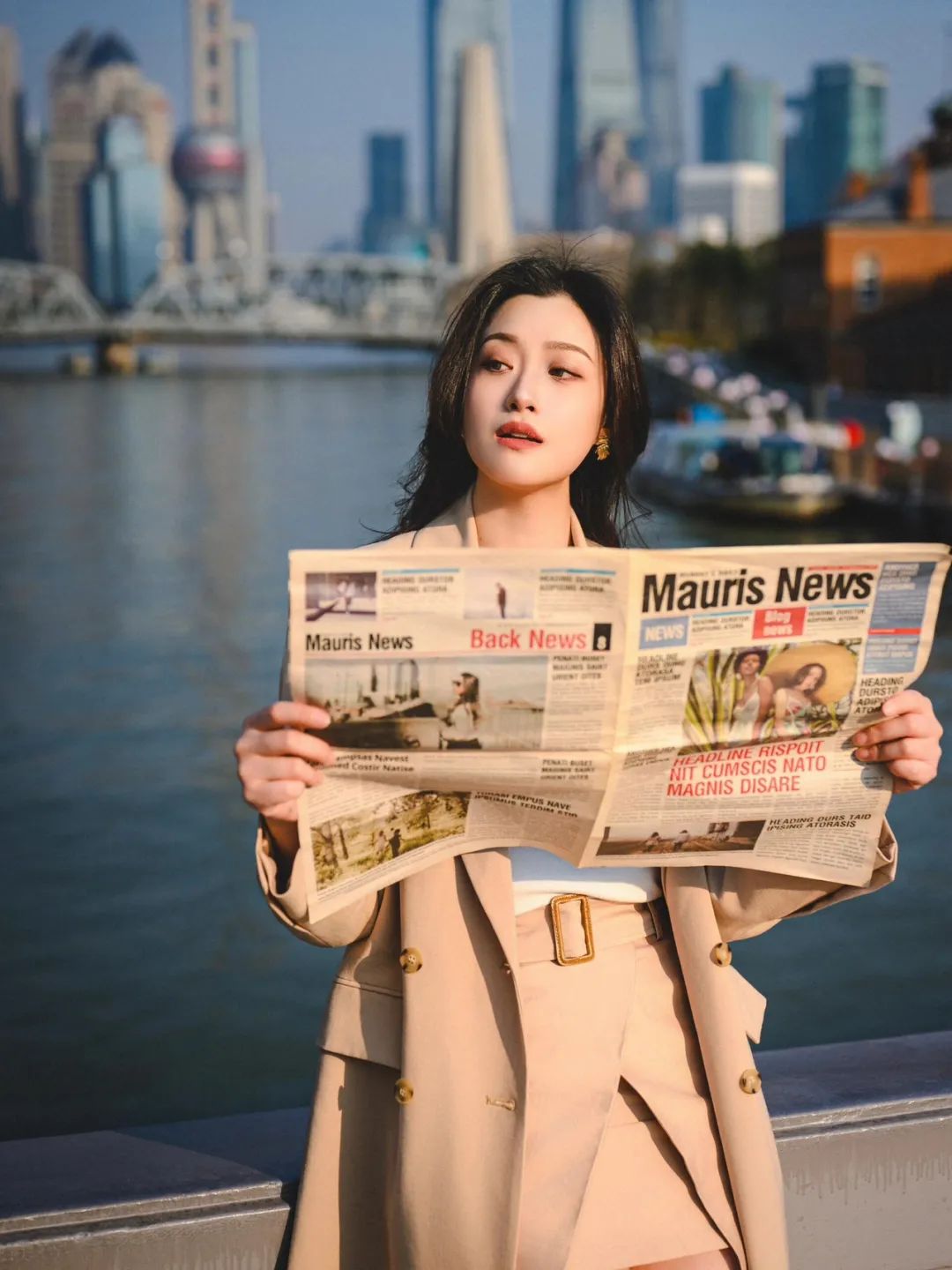 正面拿着报纸,遮挡住部分脸庞,只露出眉眼和嘴唇,微微抬起下巴,眼神似乎在专注地阅读报纸内容。在城市河流的背景衬托下,这个姿势营造出充满故事感和氛围感的画面,尽显都市时尚格调,展现出自然的美丽。