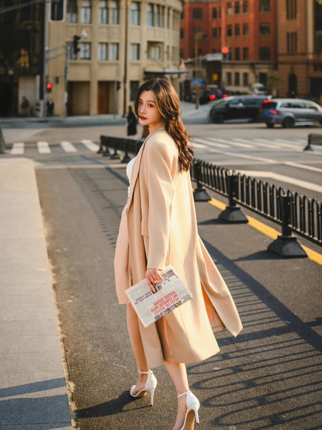 在城市街道上,手持报纸,步伐轻盈,微微侧身,这个姿势展现出优雅的曲线。长发自然垂落,米色大衣随风摆动,仿佛正悠然地漫步在都市街头,可以抓拍人物的表情动作,这样成片流露出人物不经意间的随性洒脱。