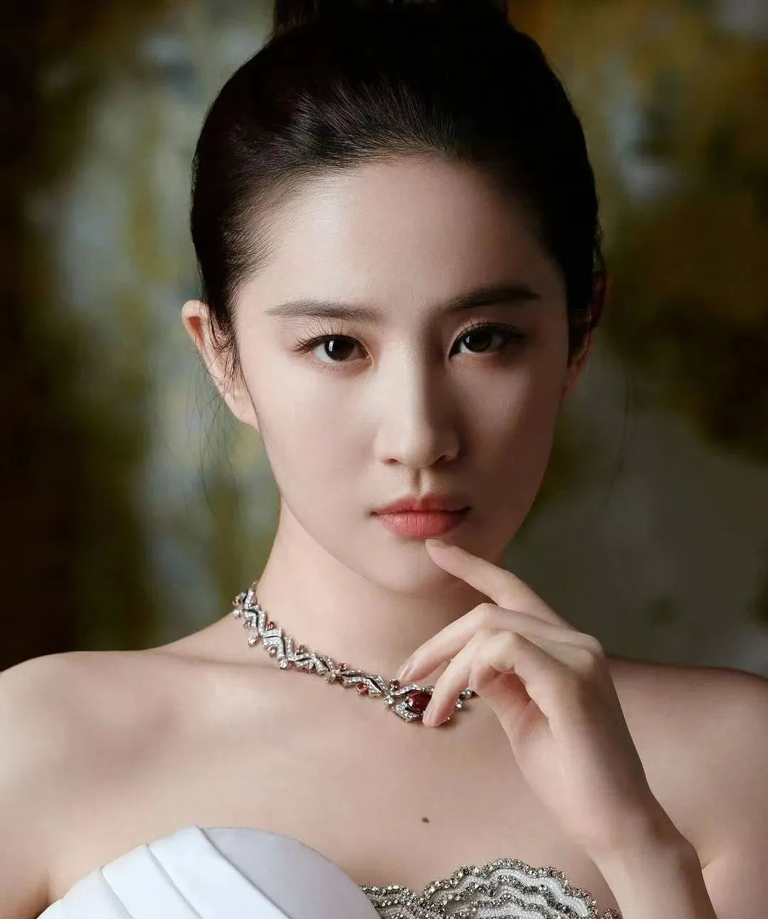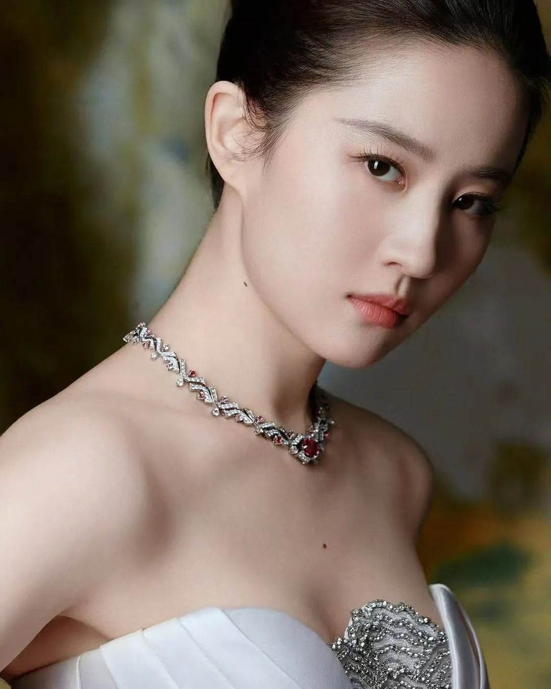 2.左手食指轻触下嘴唇,目视镜头这是拍摄礼服类照片常用的一种姿势,营造出一种俏皮但又不失庄重的氛围,搭配上刘亦菲这张神仙般的脸,给人一种可爱的感觉,让人越看越着迷。