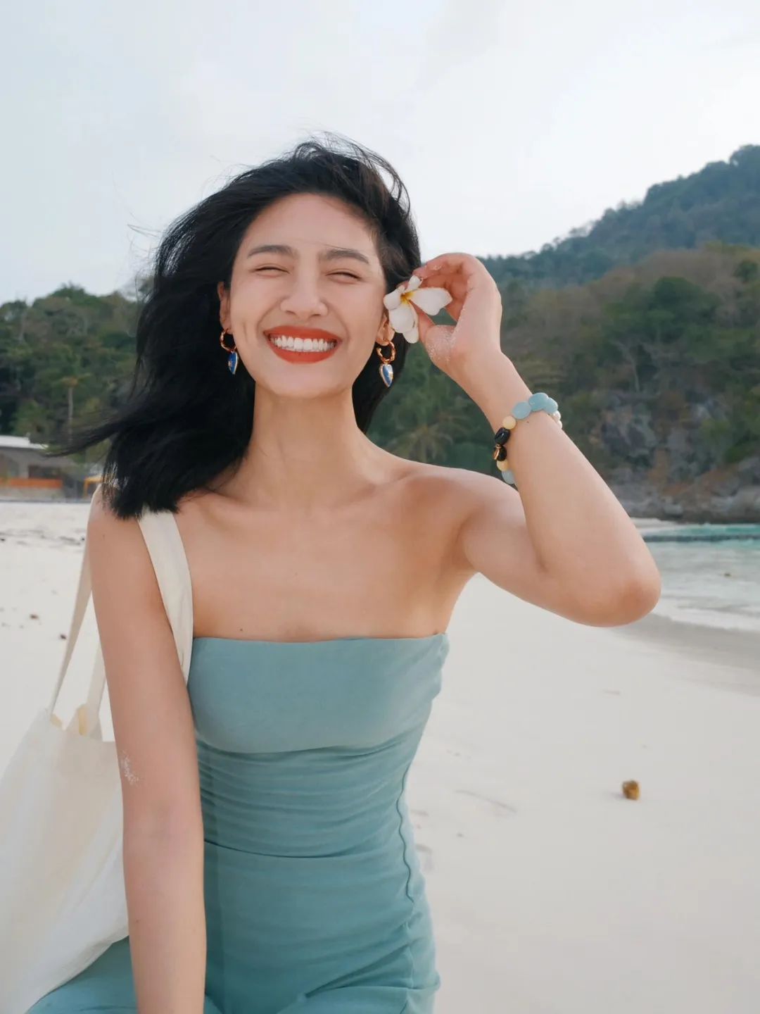 坐在沙滩上,取下草帽,手拿白色花朵贴近脸颊,双眼眯起,笑容甜美。随意散落的发丝,搭配背后的青山与沙滩,营造出慵懒又浪漫的氛围,成片效果能让人感受到海岛的闲适。