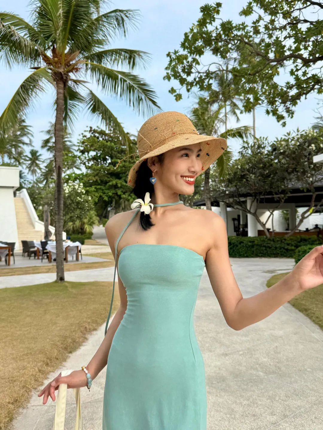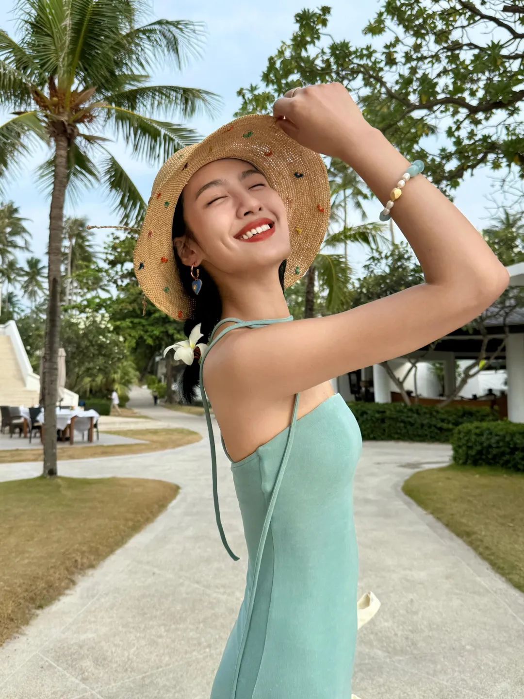 站在椰林环绕的小径旁,歪着头,一手叉腰,一手拎着米色手提包,脸上洋溢着甜美的笑容。这个姿势拍照既展现出优雅的身姿,又传递出轻松愉悦的度假心情。