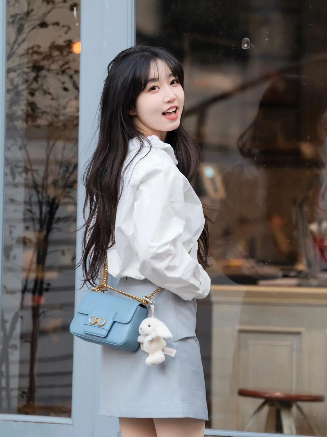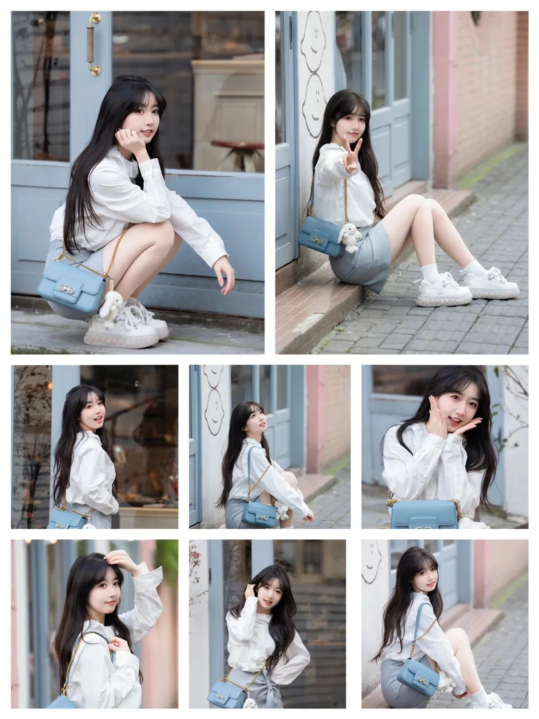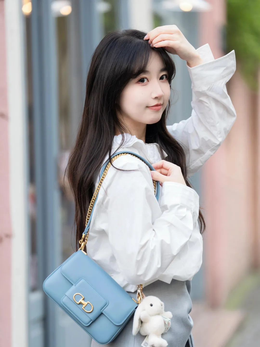 侧身而立,一手轻轻扶着肩上的蓝色包包,另一手温柔地抚摸头发,微微歪头,目光柔和且含情脉脉看向镜头。这个姿态尽显温婉大方,拍出来的照片迷人又漂亮。