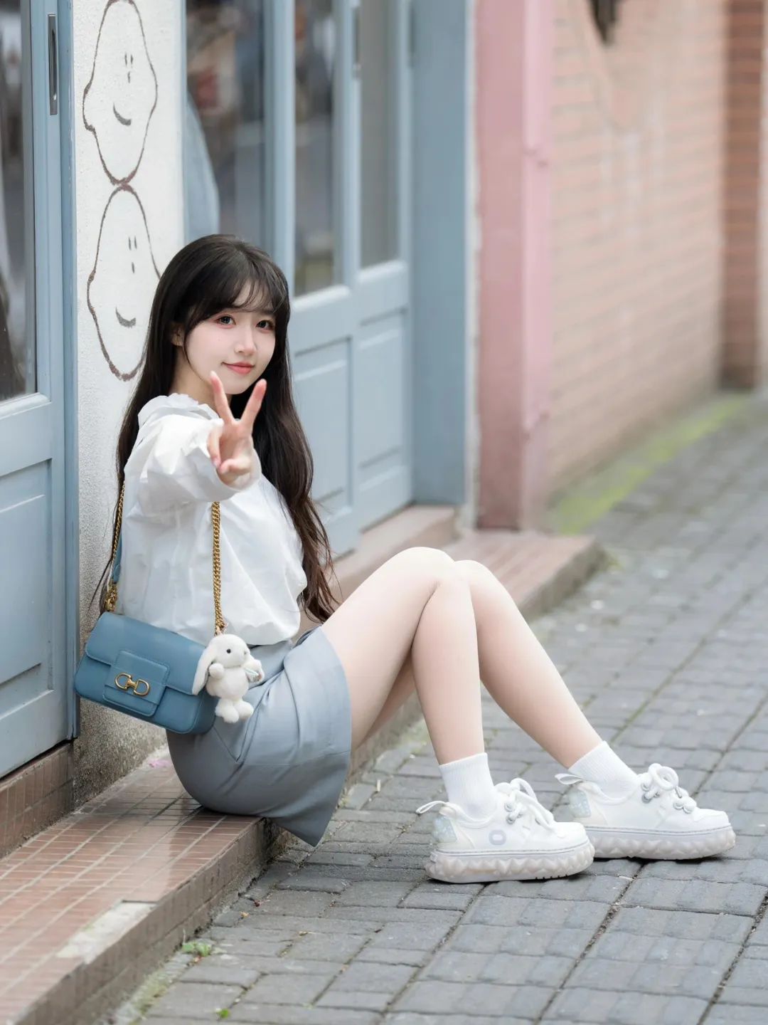 侧身坐在街边台阶上,双腿并拢微微弯曲,身体稍向前倾,一手随意搭在腿上,一手自然垂落,头轻轻侧转。这个姿势可以露出精致的侧颜,拍照时带着浅浅笑意看向镜头,拍出来的照片温柔又迷人。