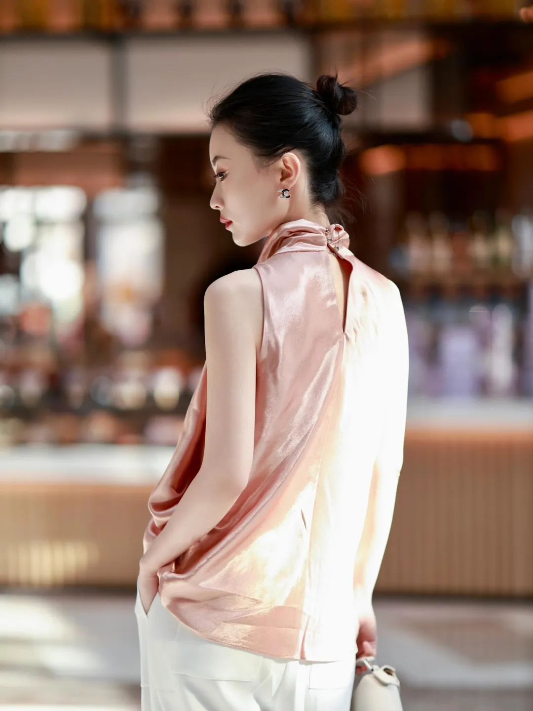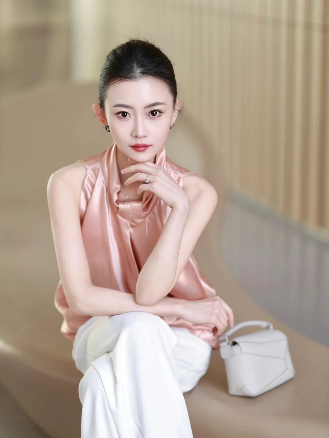 双腿交叠端坐,一手轻托下巴,目光专注地看向镜头,另一手自然搭在腿上。这个姿势传递出一种沉静的美感,粉色绸缎上衣在这一姿势下更显质感,让整体画面优雅又迷人。