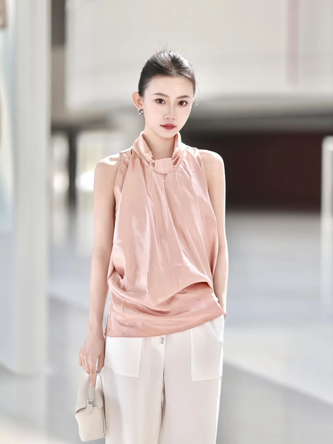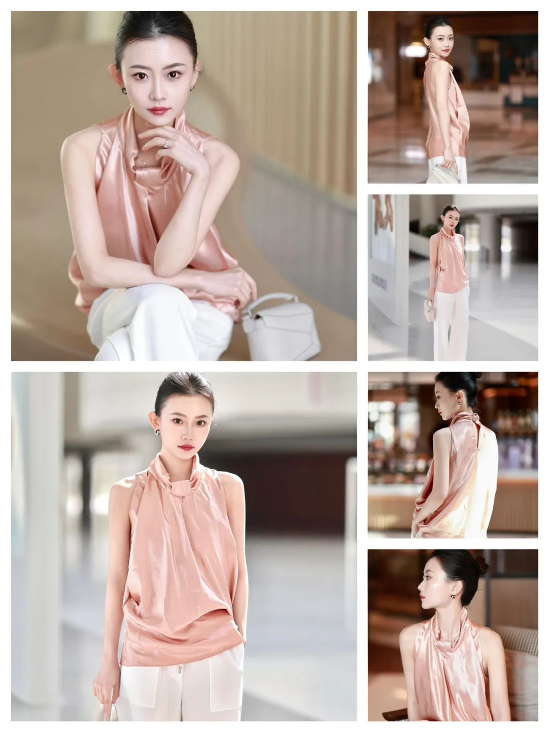一手插兜,一手持手包,自然站立,眼神坚定直视前方,表情冷艳。这样的姿势让白色阔腿裤的大气与粉色上衣的柔美相互映衬,拍出来的照片凸显出干练又不失优雅的气质,时尚感十足。