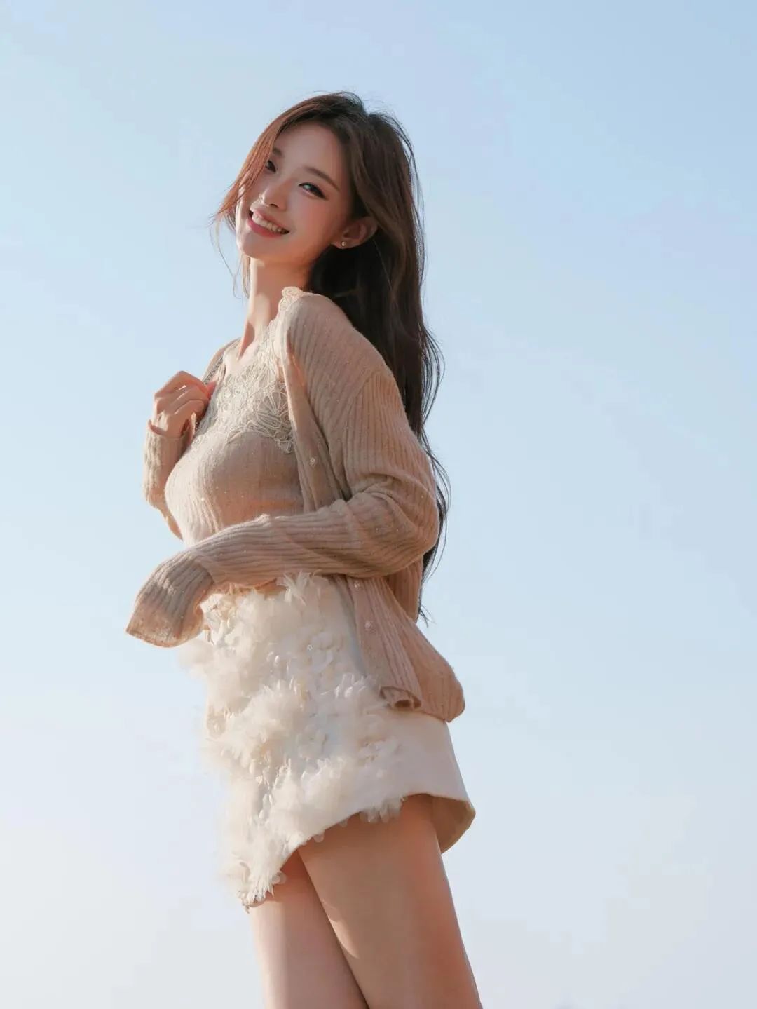 微微侧身,一手轻拉衣服,另一手弯曲,头微微抬起,面带笑容看镜头。湛蓝的天空作为背景,让整体画面简洁清新,拍照时可仰拍凸显人物的纯真可爱,仿佛是田园中灵动的精灵。