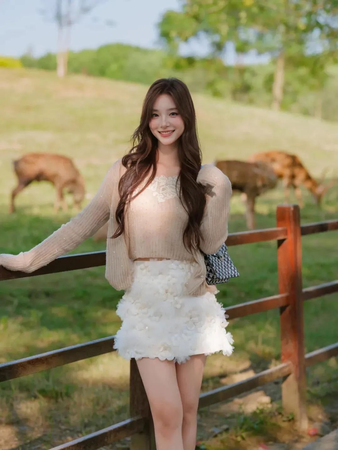 面向镜头站立在木栅栏前,双手交叠置于身前,脸上绽放着甜美的笑容看向镜头。长发自然垂落,身后的小鹿作为拍照背景,让整个画面洋溢着恬静的氛围,拍出来的照片青春甜美。