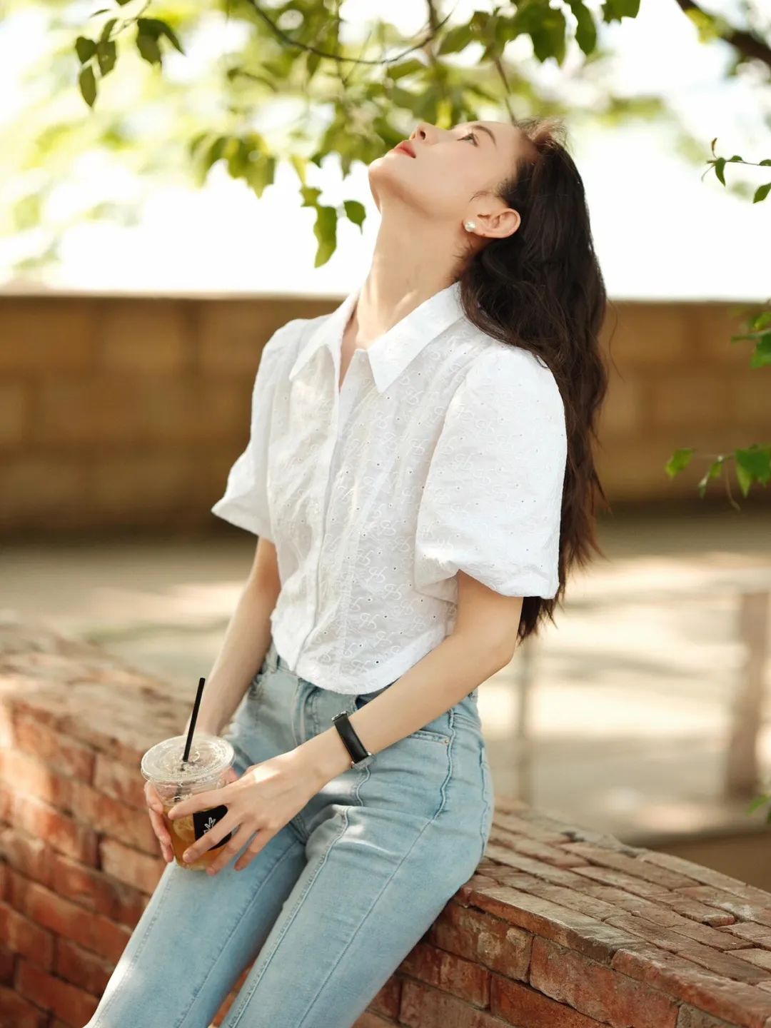 在林荫道上缓步前行,一手拎包,一手轻撩头发 。这样的姿势简约大方,白衬衫和牛仔裤的搭配清爽利落 ,随手一拍都是大片,时髦又高级。