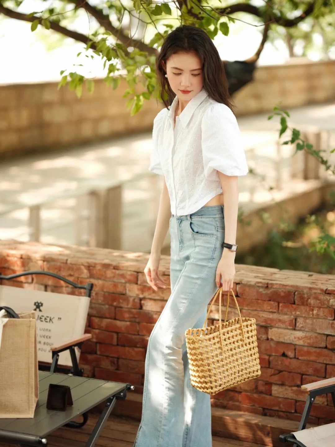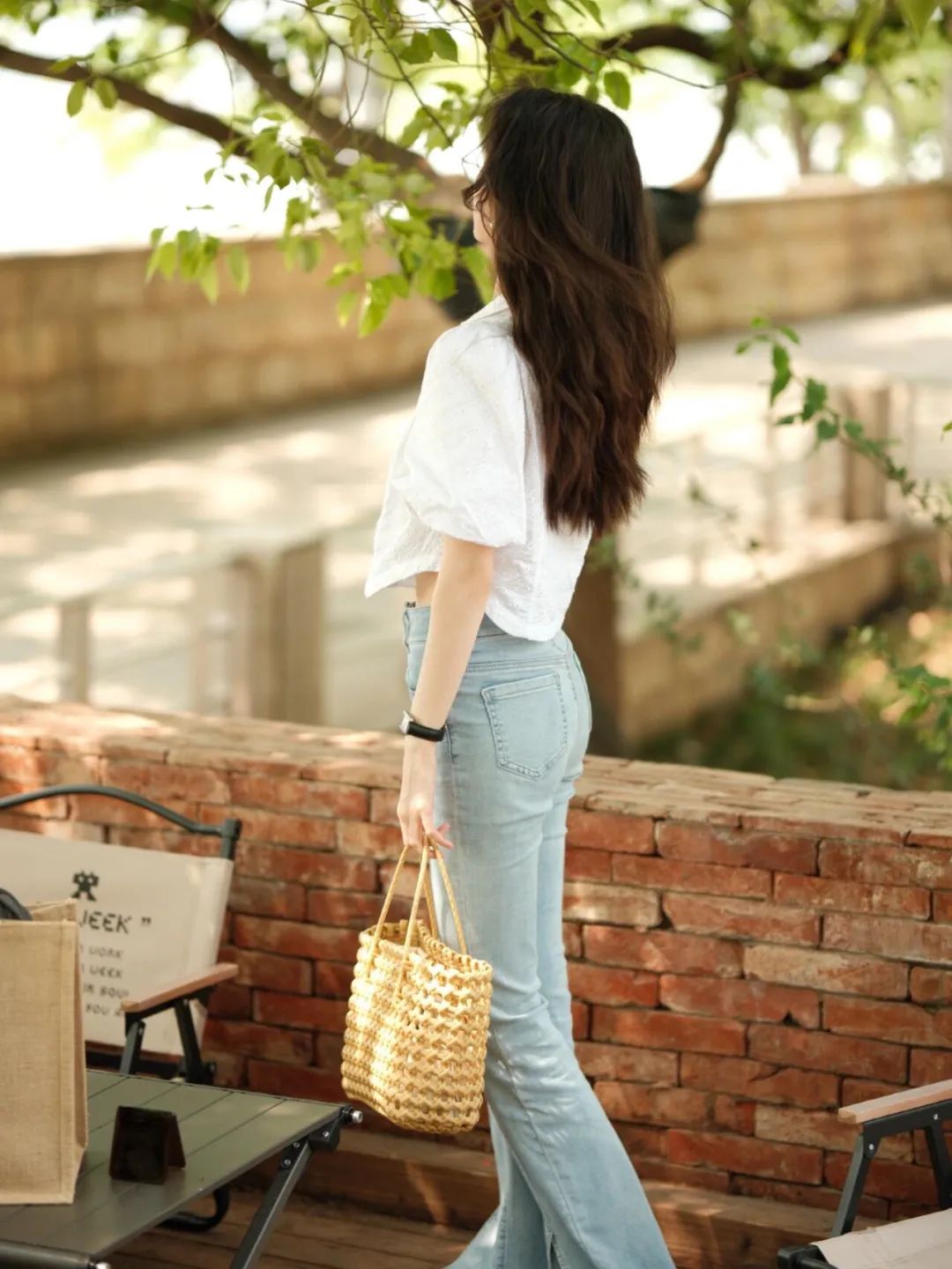 侧身倚靠木栅栏,一手拎草编包,双腿交叉站立,目光坚定直视镜头。这样的拍照姿势展现出自信姿态,拍出来的照片简约时尚感十足,让白衬衫和牛仔裤的搭配更具魅力。