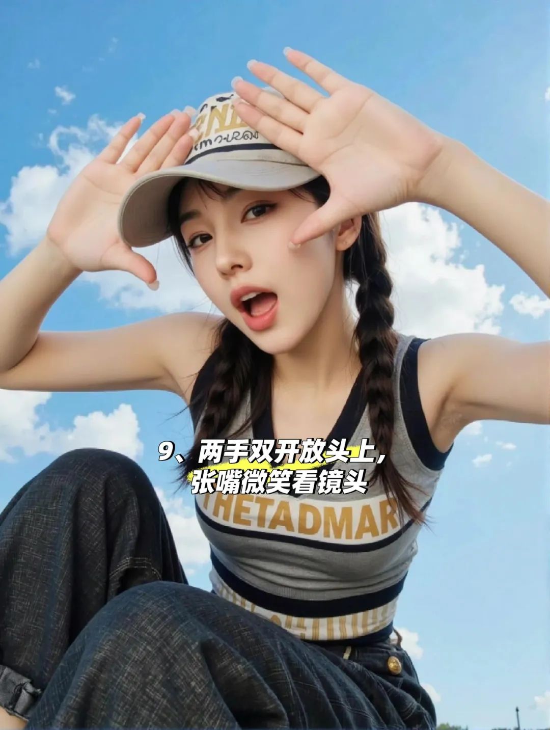 双手在头顶呈开放状,嘴巴张开露出灿烂的笑容看向镜头,夸张的表情充满感染力。这种大动作拍出来不仅有活力,还让整个画面更有层次感,随便一拍都是元气满满的状态,成片画面洋溢着青春的肆意与张扬。