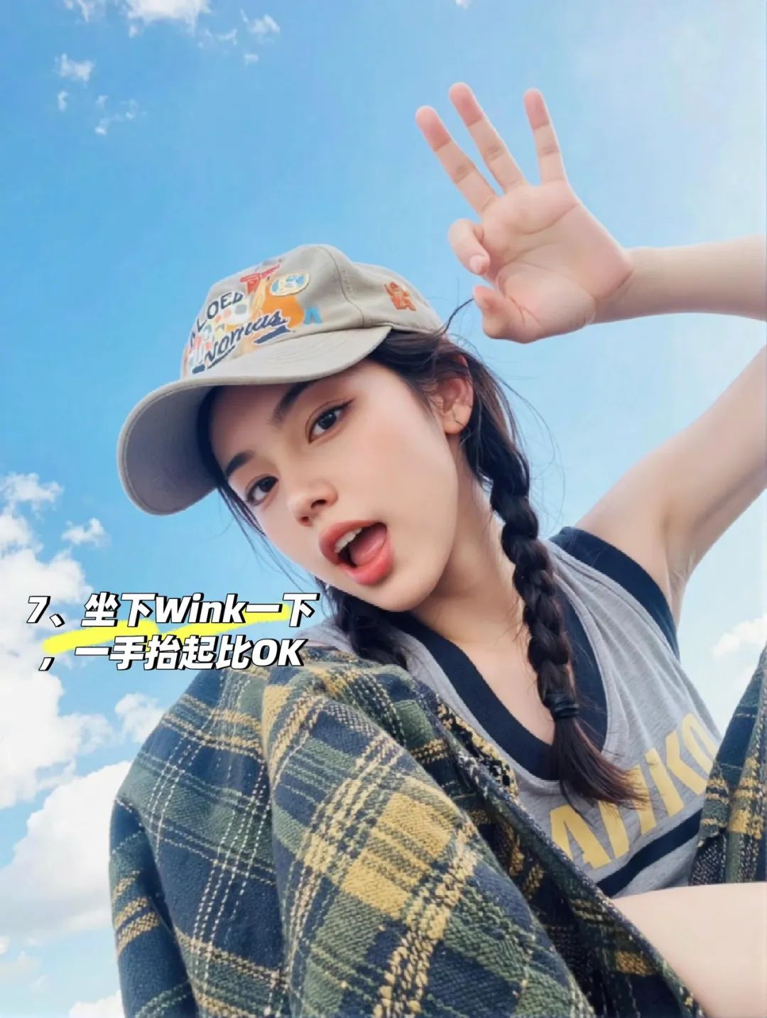 自然地蹲下,单手轻轻捂住嘴巴,还俏皮地眨了一下眼睛(Wink)。这个动作尽显可爱俏皮,让人感受到满满的青春活力,拍出来的照片绝对是百拍不厌的耐看款。