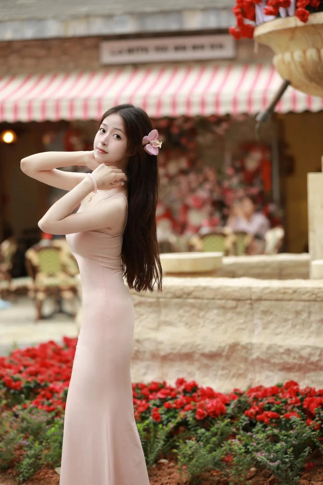 侧身挺直站立,双手抬起轻触脖颈,微微歪头 ,眼神看向镜头。这样的拍照姿势不仅能增添日常感,还能让整个人看起来更具温柔气质。身后鲜艳的花丛和条纹遮阳棚为背景,增添了照片画面的色彩层次感,凸显人物俏皮又甜美的感觉。
