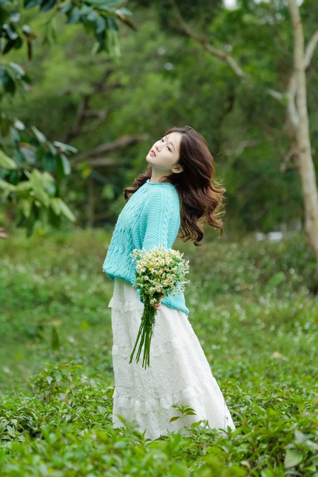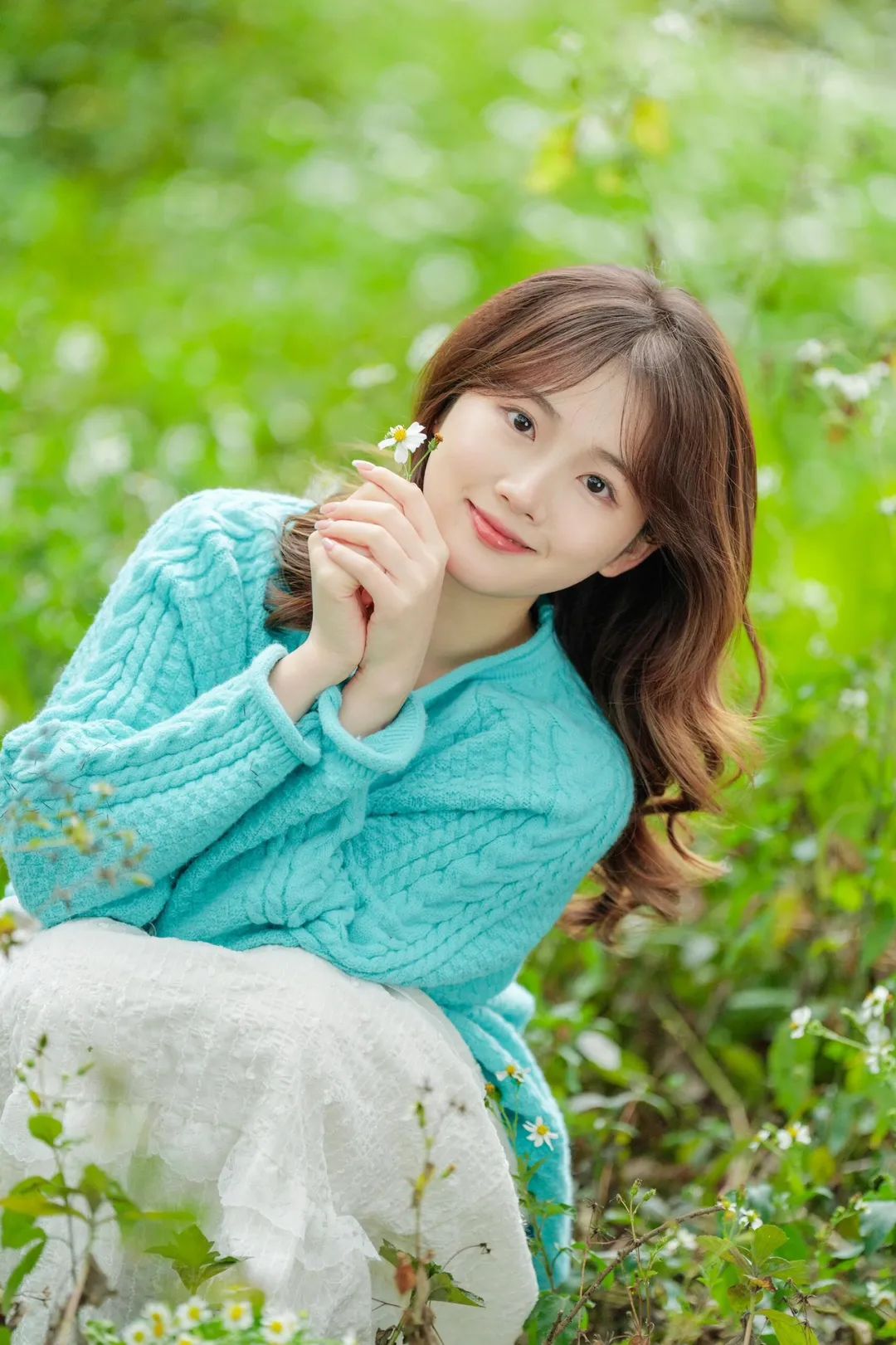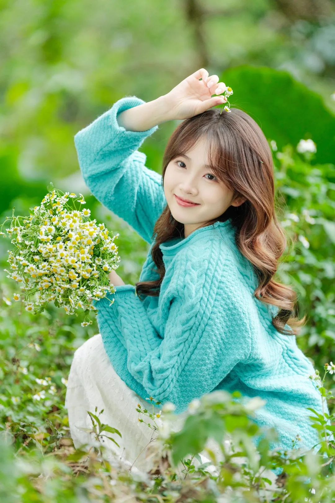 半蹲于花草间,手持小雏菊束,一手轻托腮,歪头甜笑看向镜头。这一姿势尽显俏皮可爱,不仅凸显出少女的纯真,还能很好地与周围自然景致互动,拍出来的照片瞬间拉近和观者的距离。