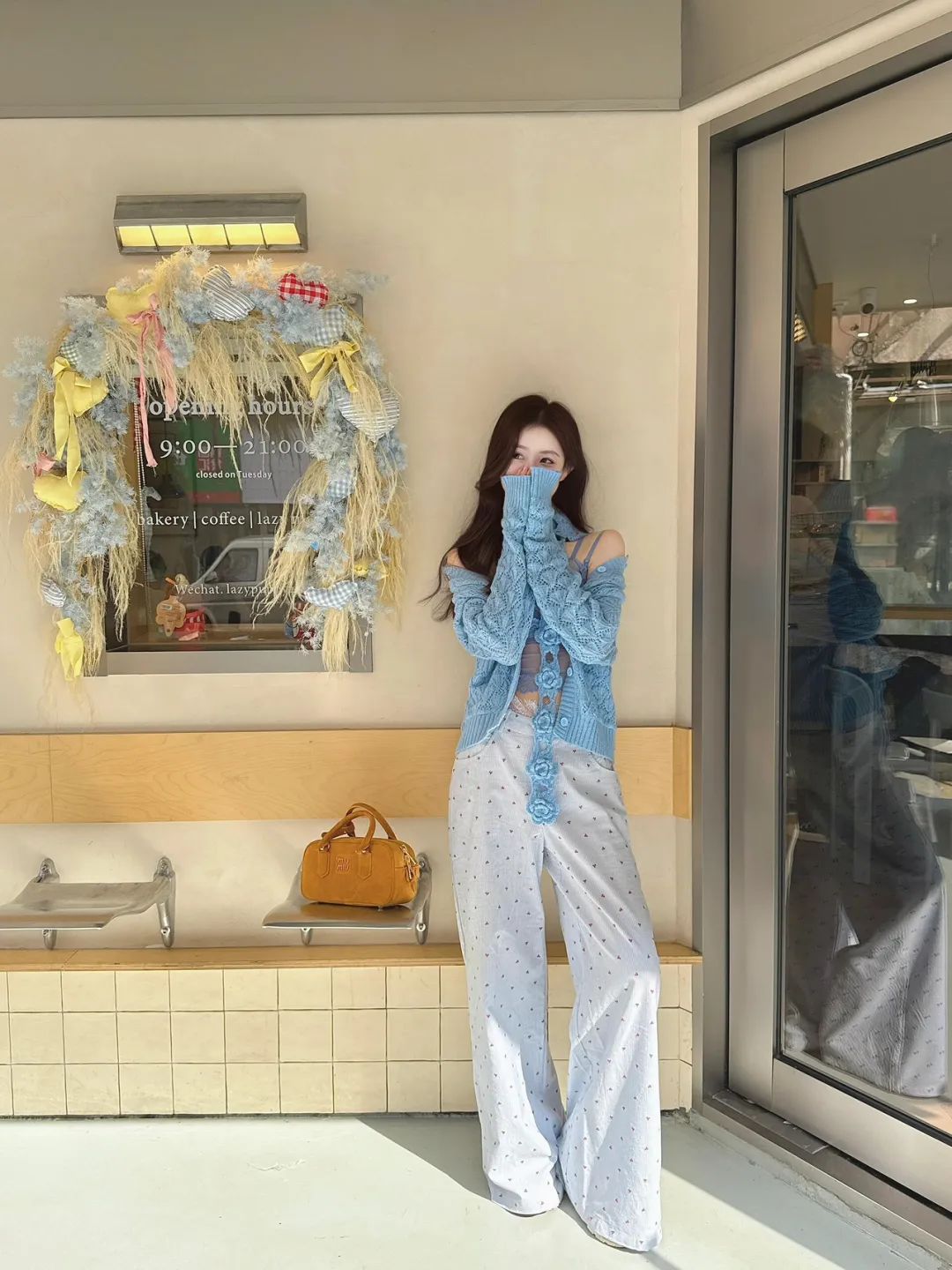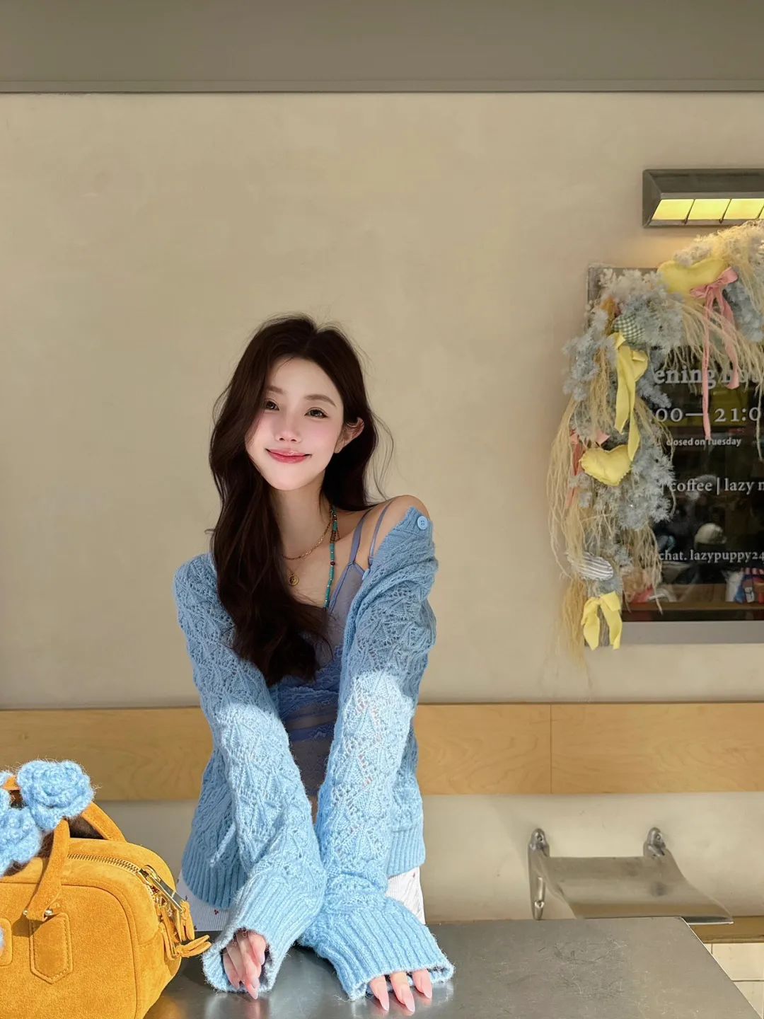 站立在长椅旁,一手拎着精致的黄色包包,手臂自然下垂,另一手轻轻搭在身侧,微微歪头看向镜头站立。搭配甜美的笑容,瞬间拉近与观者的距离,拍出来的照片很上镜,而且亲和力十足。