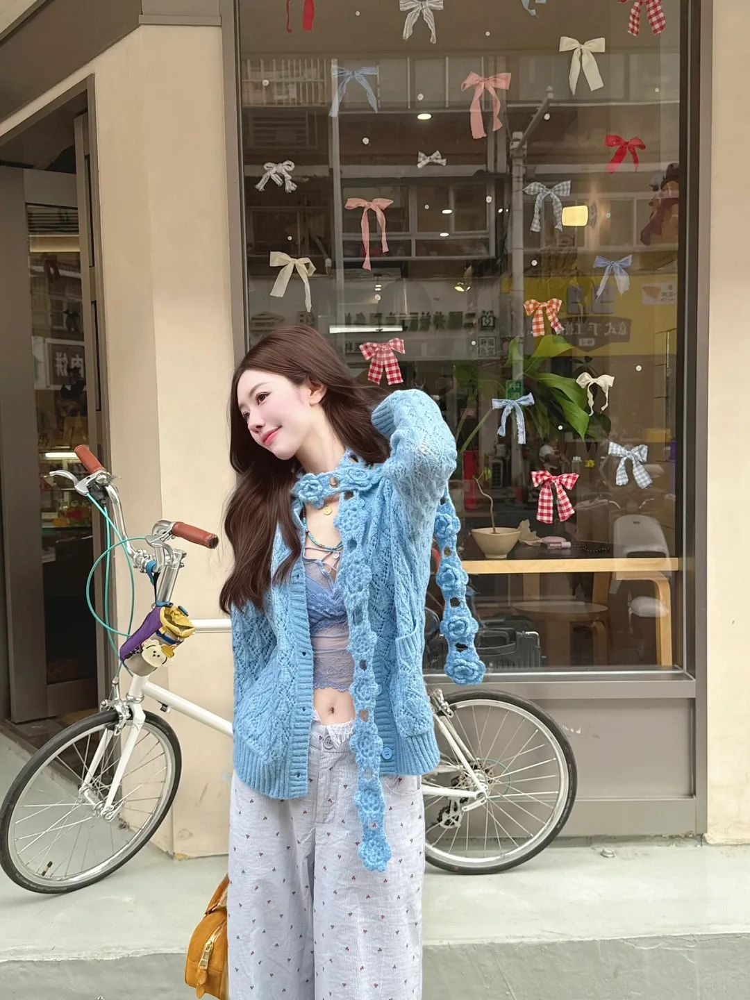 站在自行车旁,一手撩起长发,动作自然流畅,展现出女性的柔美。侧身面对镜头,这个姿势勾勒出侧脸的线条,眼神看向远方,营造出文艺又浪漫的氛围感。