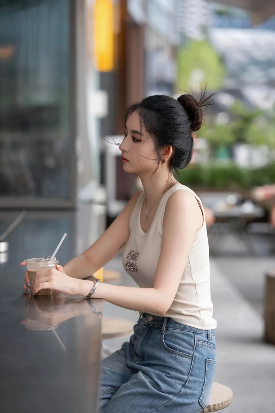 侧身坐在吧台凳子上,双手捧杯,侧脸望向远方。这个姿势让整个人看起来恬静又放松,仿佛在享受悠闲时光,画面充满故事感,能轻易引发观者的共鸣。