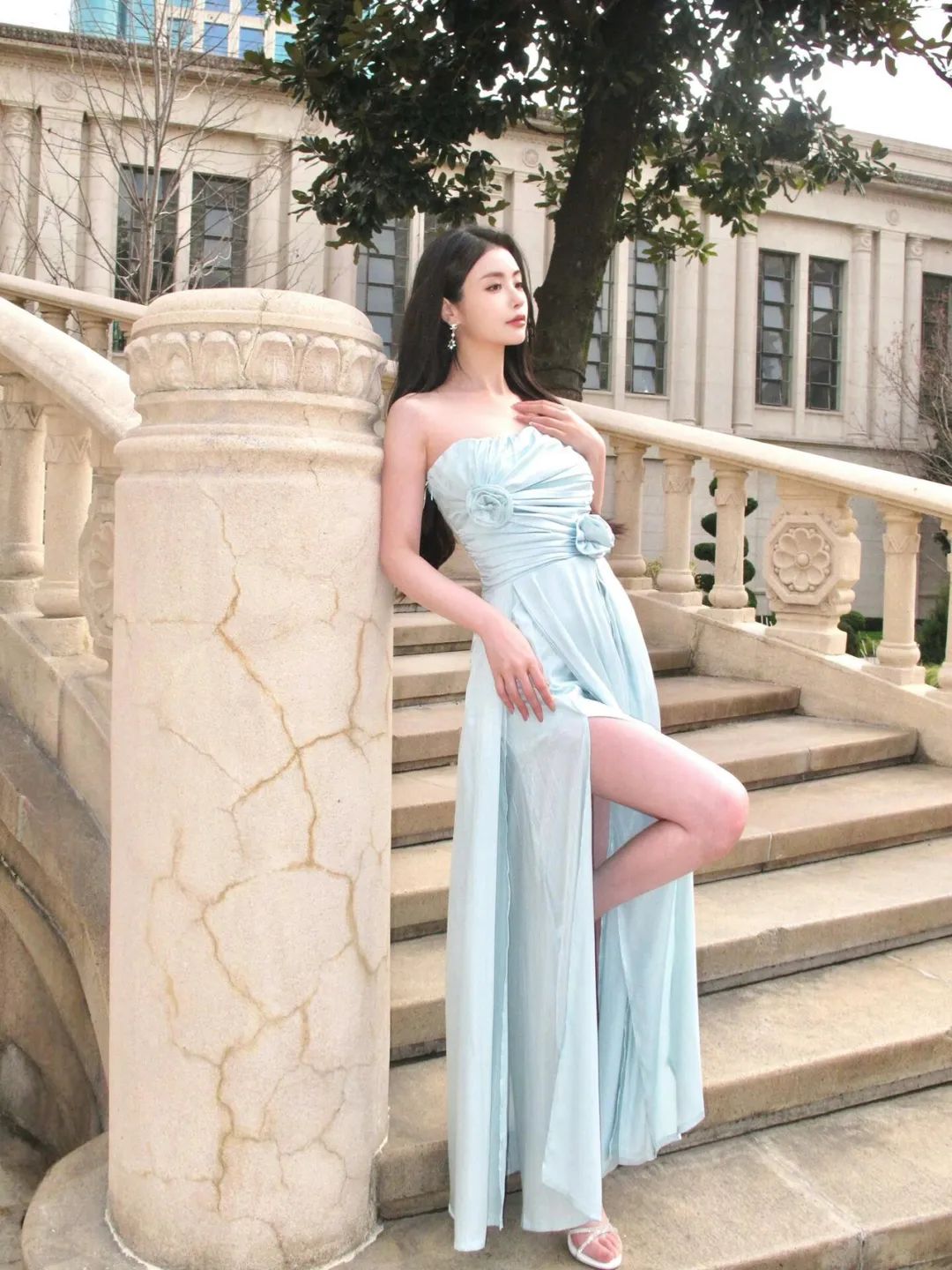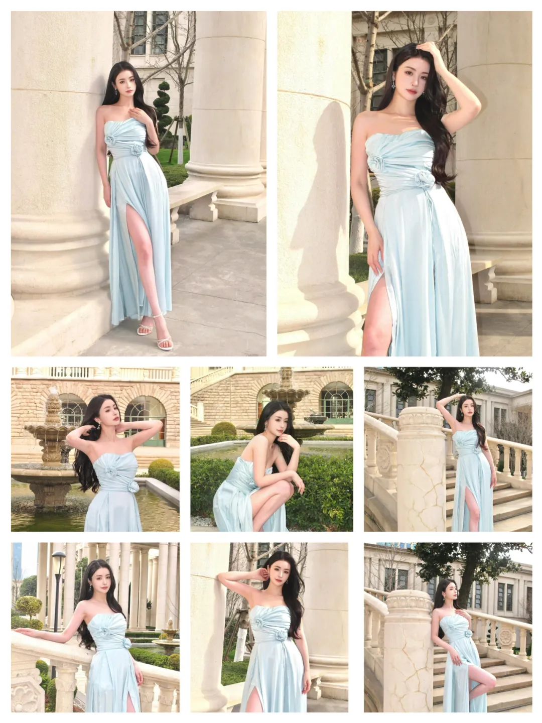 倚靠着石柱,一手轻放在胸口,身姿微微侧转,双腿一屈一直。眼神沉稳直视镜头,展现出冷艳气场。淡蓝色抹胸长裙的高开叉设计,巧妙露出修长美腿,拍出来的照片既凸显身材曲线,又增添了几分性感与优雅。