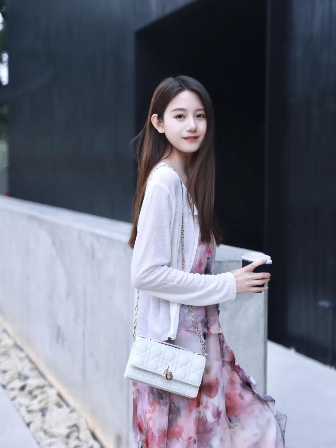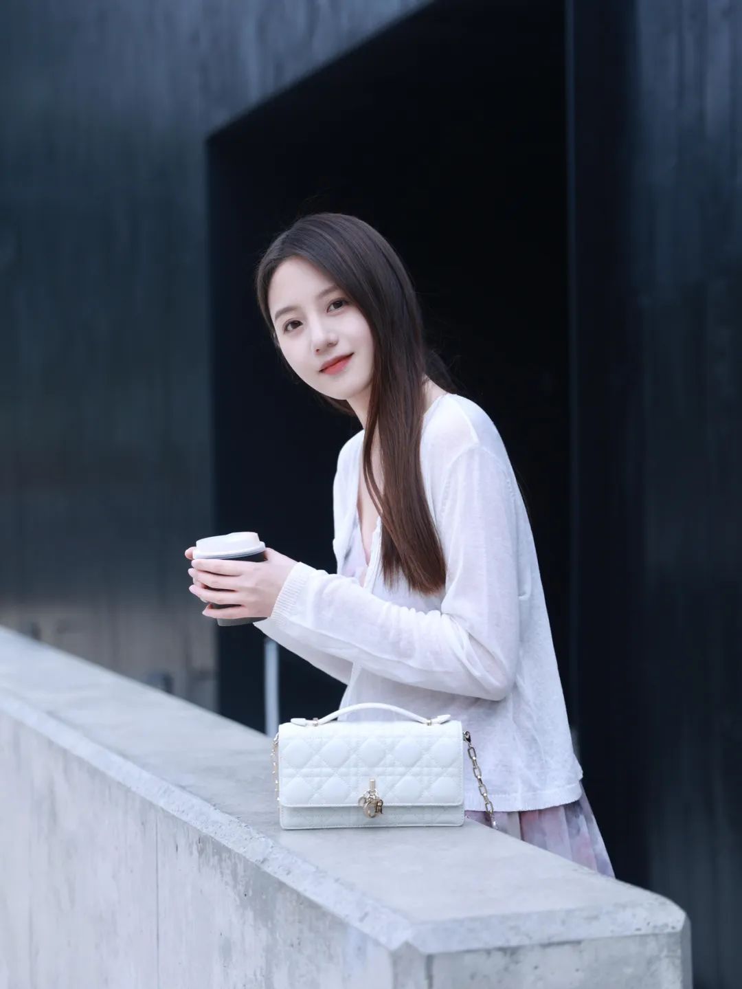 单肩挎着精致的包包,手持咖啡杯侧身自然站立,面带微笑看向镜头。这样的姿态端庄自信,简单的动作却展现出时尚与优雅的融合,咖啡和包包的搭配也恰到好处,为照片画面增添了精致感。