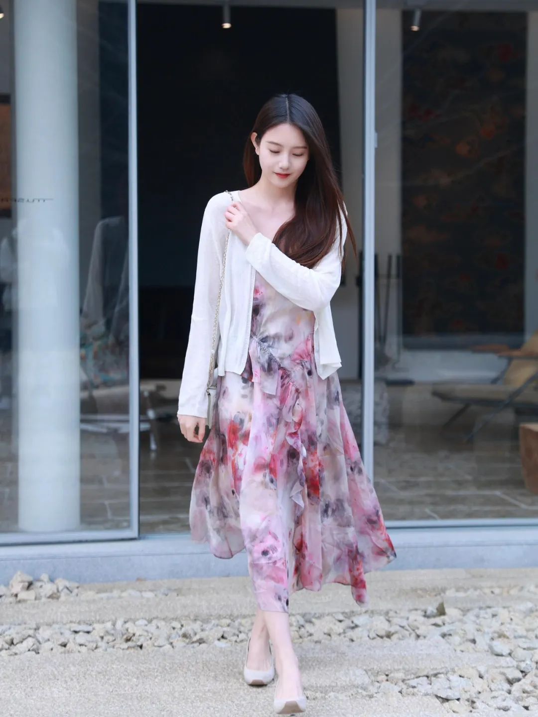 在行走过程中,一手轻轻拉着披肩,另一手自然下垂,目光低垂,流露出一种不经意的美。飘动的裙摆和自然的动作,让照片画面充满了动感与故事感,仿佛是在记录一段悠闲的漫步时光。