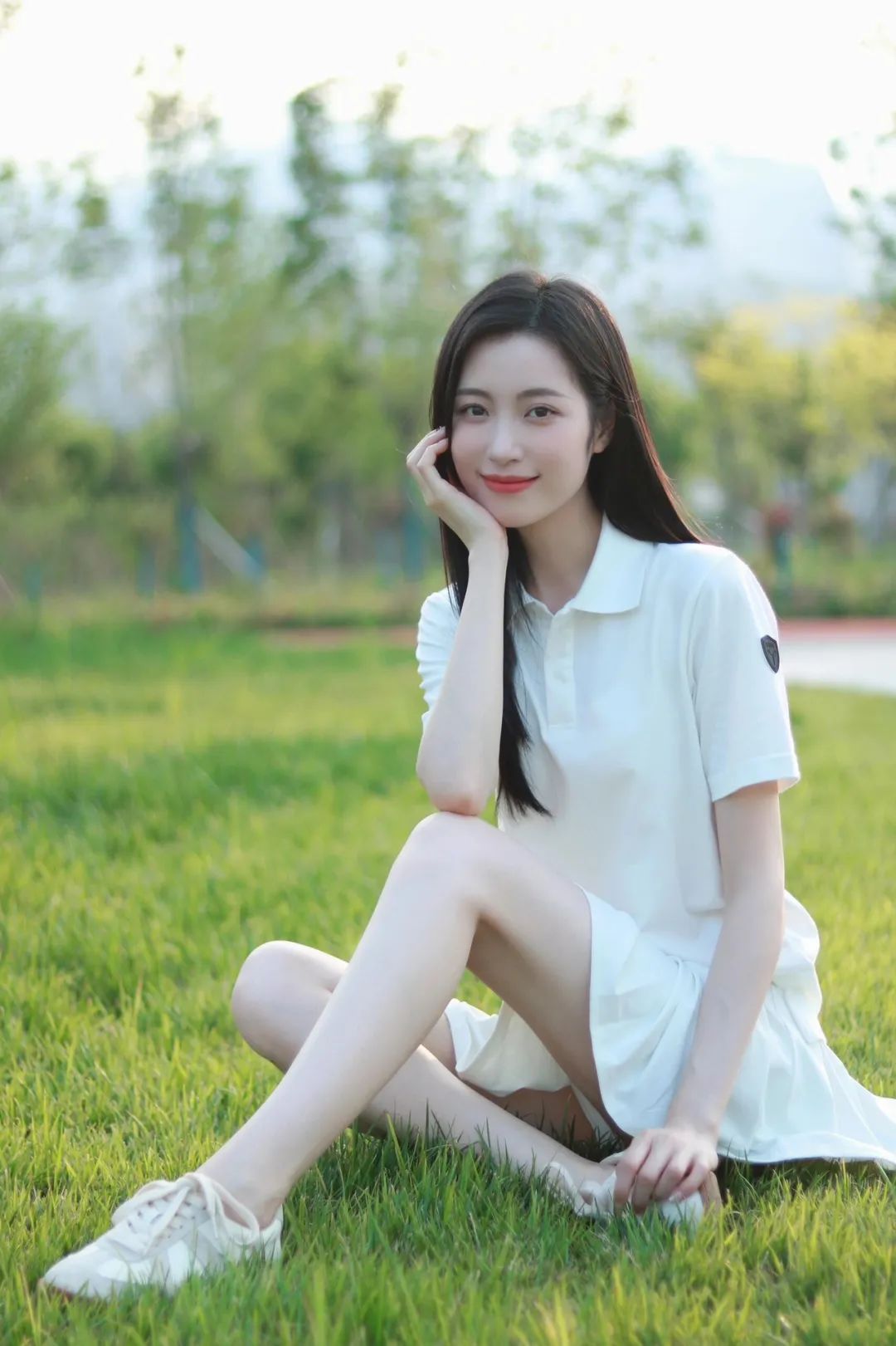 坐在草地上单手托腮,眼神温柔看向镜头,笑容甜美。拍照时低角度仰视拍摄,这样能突出人物的面部表情,拉近与观者的距离,照片画面充满温馨。
