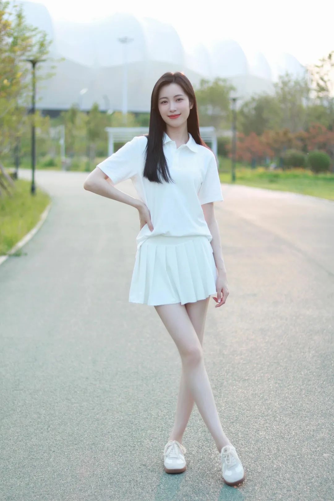 侧身自然站立于道路,一手微微抬起,身体微侧,姿态舒展又优雅。背景中的建筑和绿植虚实结合,既交代了户外环境,又不会分散对人物的注意力。成片效果让白色的服装显得更加干净清爽。