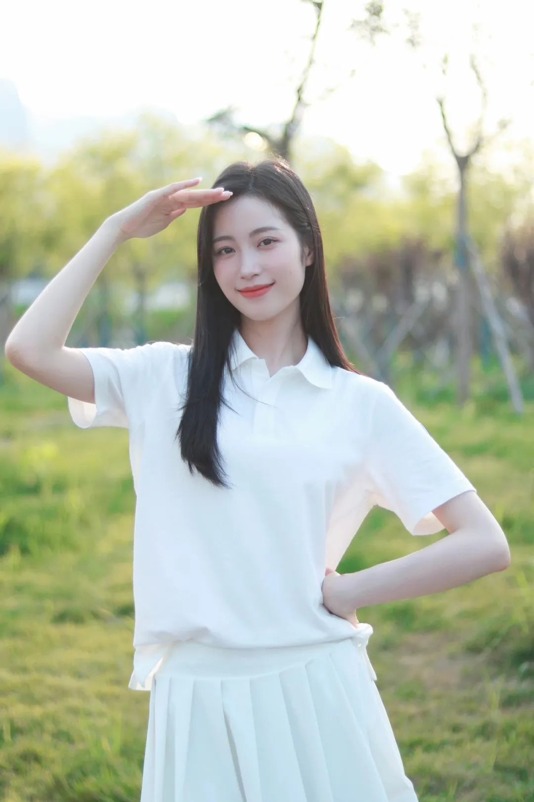 面向镜头站立,一手搭额一手叉腰,俏皮的姿势瞬间点亮画面。在逆光的作用下,发丝都仿佛镶上了金边,营造出柔和且浪漫的氛围,让整个人看起来青春无敌。