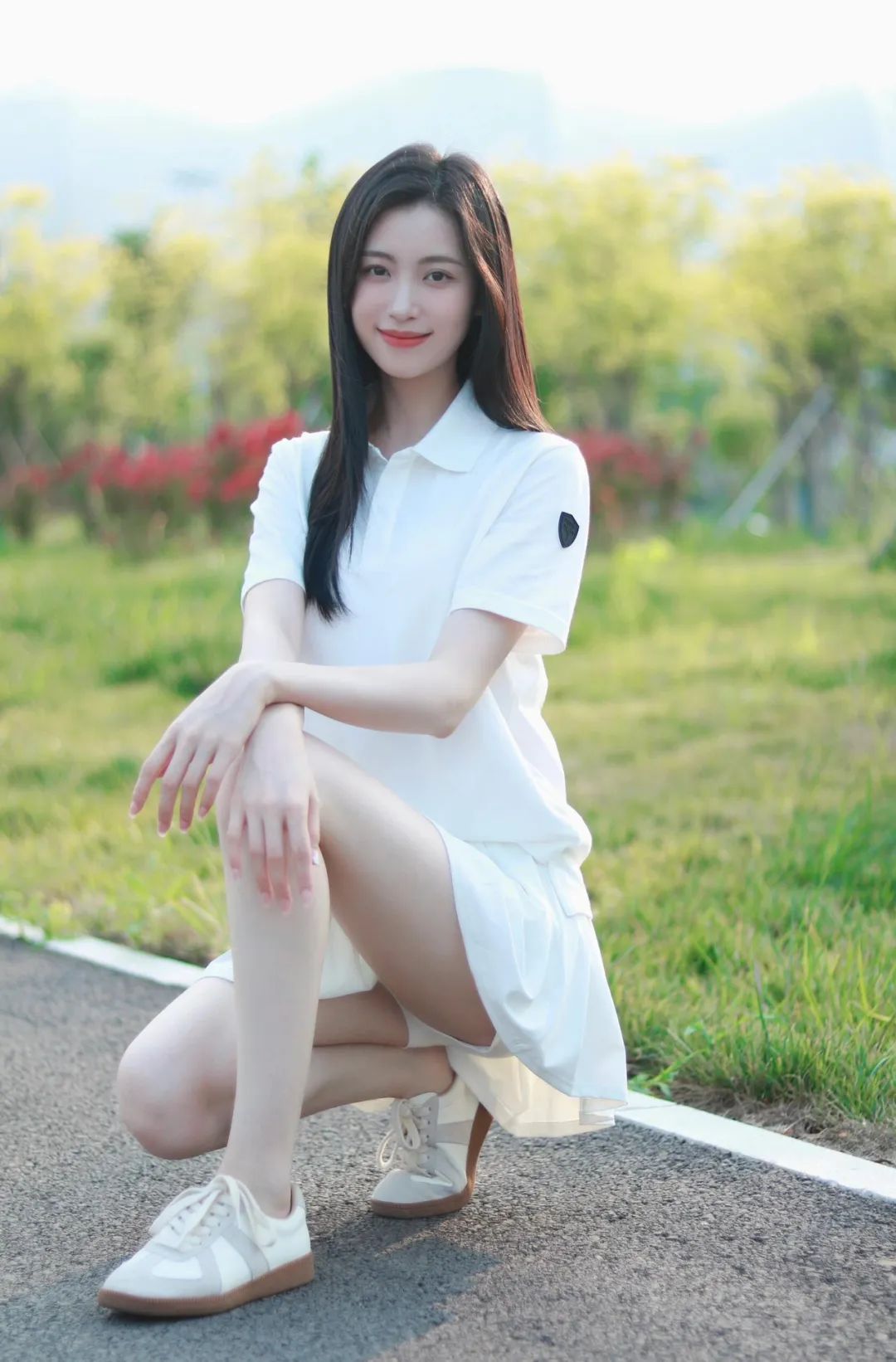 单膝跪地,双手交叠放在腿上,身体微微前倾,这个姿势既俏皮又充满青春活力。道路和草地组成简洁的背景,光线照亮人物,让整体画面洋溢着青春的朝气与灵动。