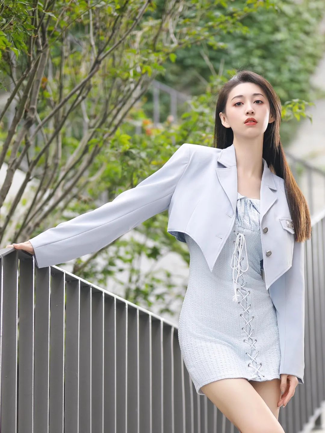 在楼梯场景中,手扶栏杆身体侧转,双腿交叉姿态形成优美线条。眼神看向一侧,表情冷峻,与清新的浅蓝套装形成反差感。这样的动作丰富画面层次,既展现了穿搭的整体效果,又增添了自然的氛围感。