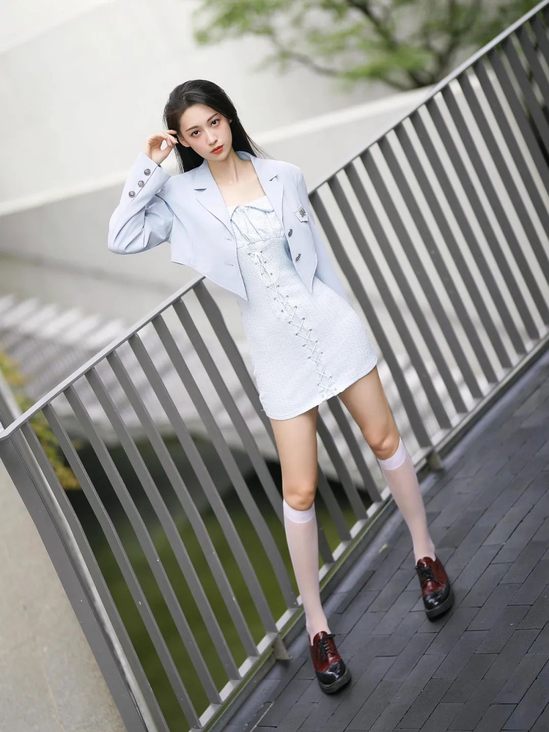 俯拍视角下,单手撑栏杆,双腿交叉,整体姿态俏皮又自信。白色中筒袜与酒红色厚底鞋的搭配吸睛,与浅蓝套装形成色彩碰撞。通过俯拍能更好地展示全身穿搭,让腿部线条显得更加修长,整体画面时尚感满满。
