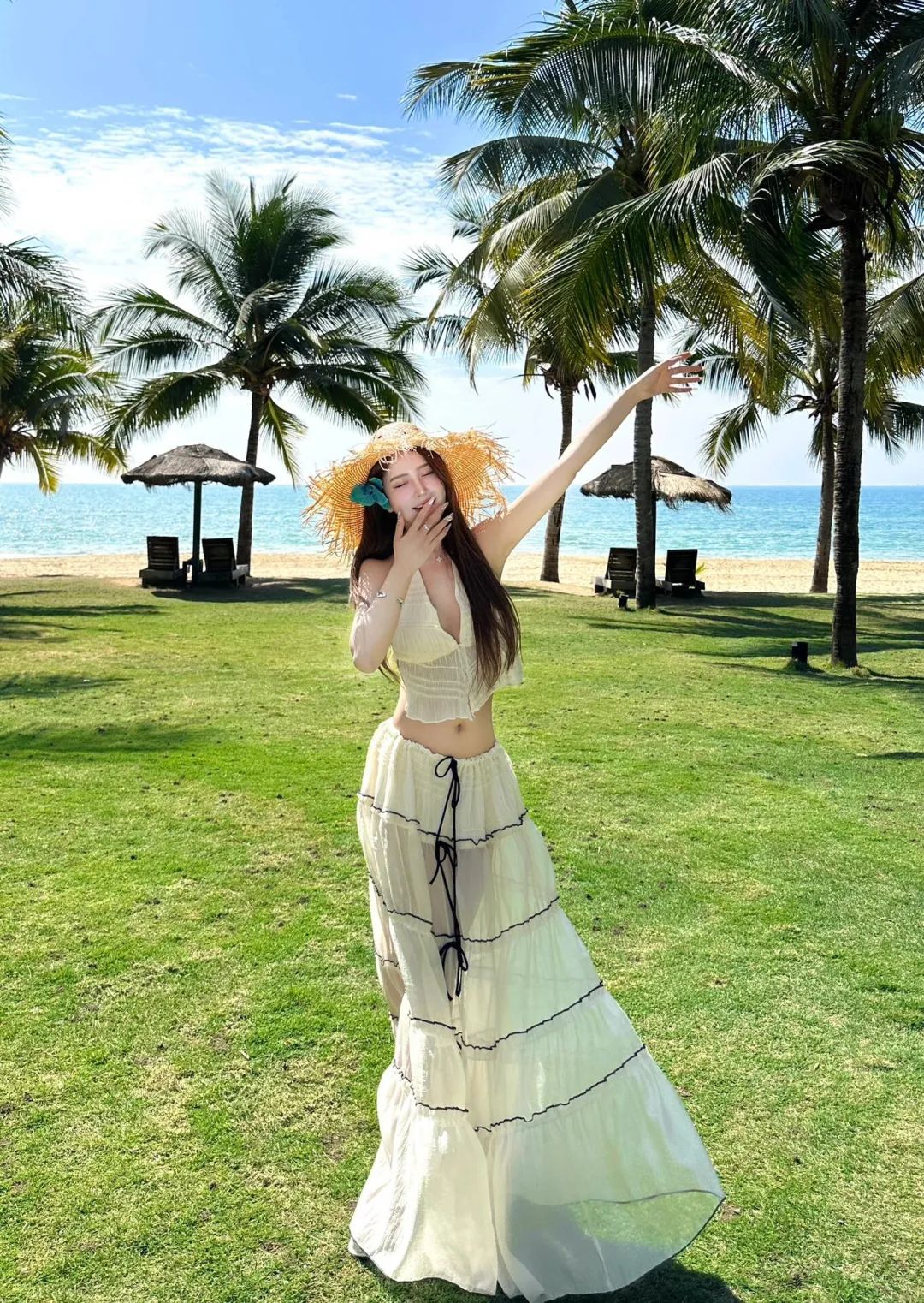 头戴草帽自然站立,一手抬起向外伸展,另一手掩在嘴边,双眼轻闭,身体微微倾斜。整体姿态动感十足,同时为拍照画面增添了俏皮与可爱 ,让人感受到了度假的愉悦。