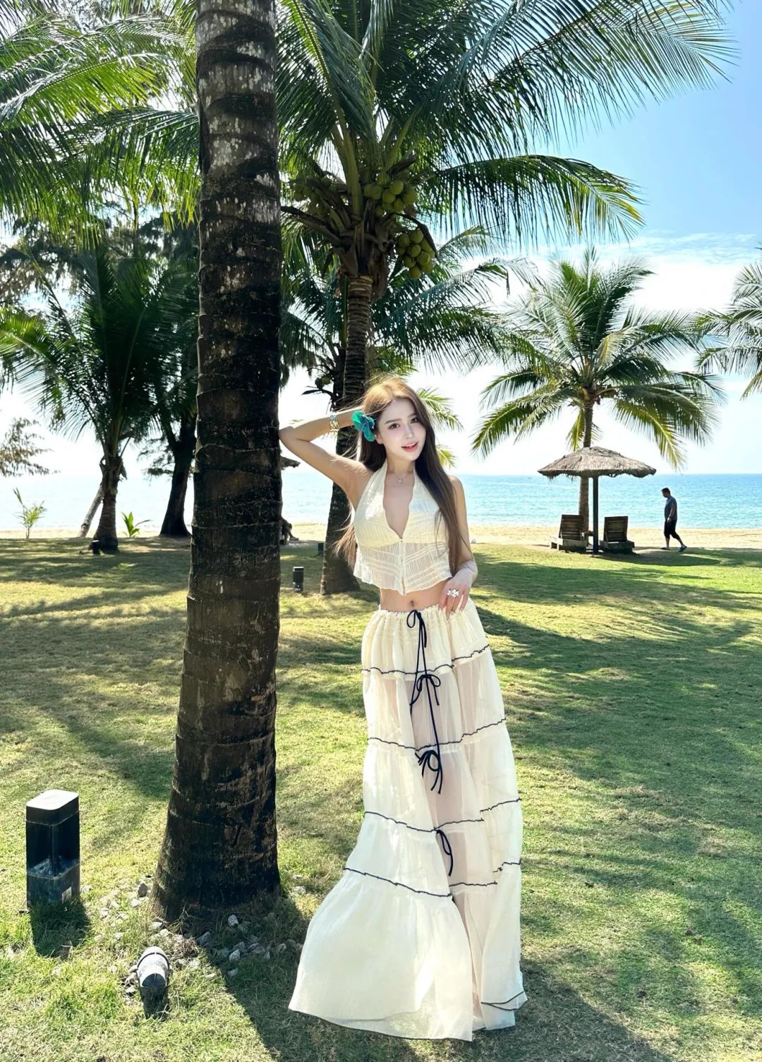 单手扶头,站立在椰子树旁,微微侧身看向镜头微笑。这样的姿势展现出随性自然的状态,能够很好的凸显身材曲线。拍出来的照片惬意悠闲,整体姿态优雅又能很好地融入美丽的海滨风光中 。