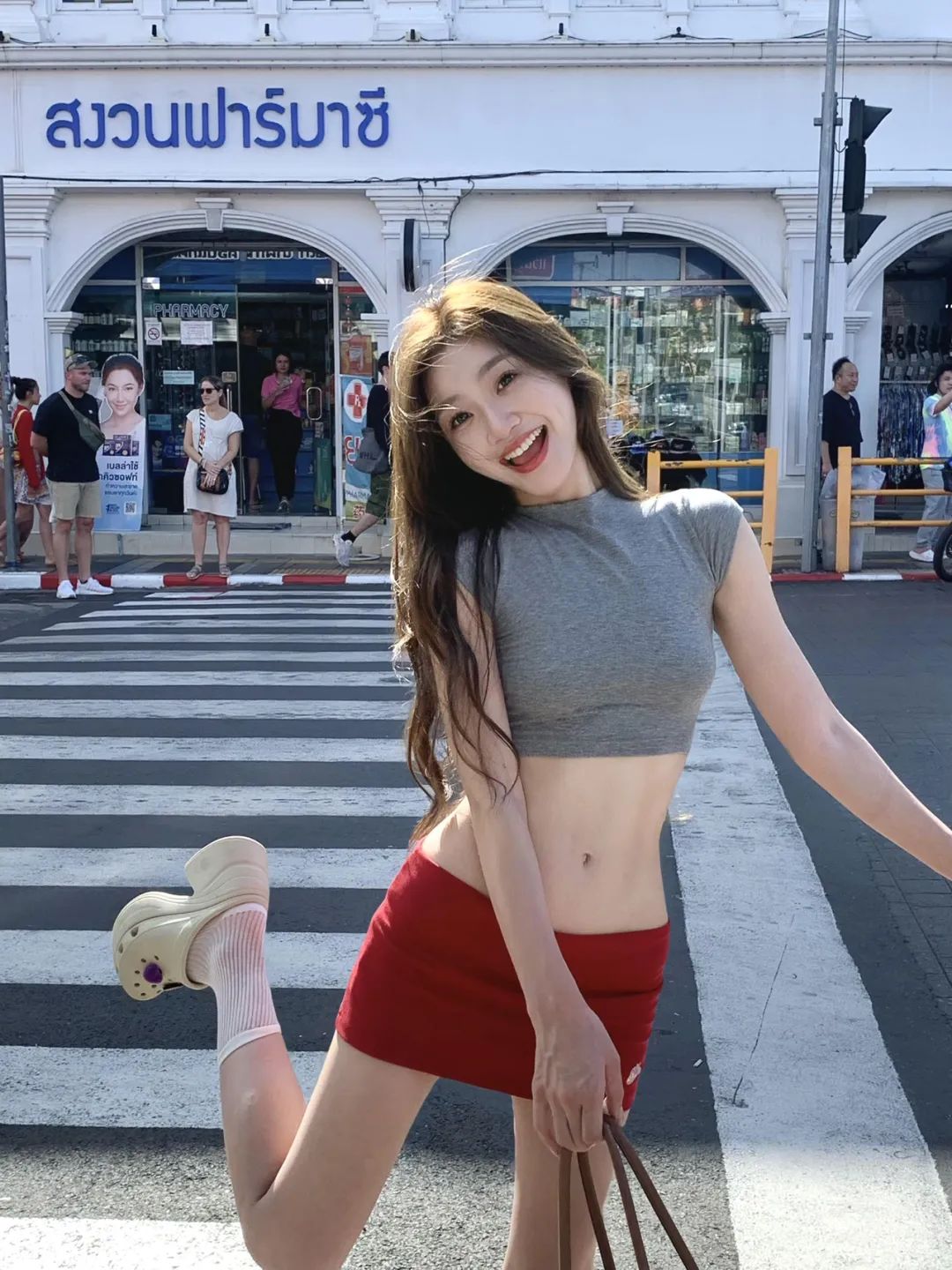 一腿向后抬起,身体微微扭转,一手自然下垂拎着包,一手向外伸展,面向镜头微笑。这种姿势与热闹的街道背景相融合,拍出来的照片充满青春活力与轻松愉悦,街景作为背景能为照片增添几分韵味。