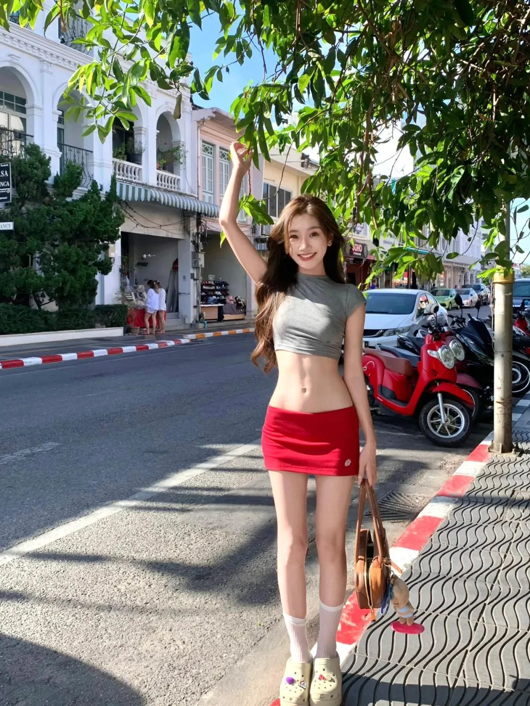 面向镜头站在路边,一手向上轻抓树枝,另一手拎着包自然垂下。这样的动作展现出灵动的姿态,同时拉长身体线条。营造出松弛的拍照氛围,拍出来的照片凸显身材,又有层次感。