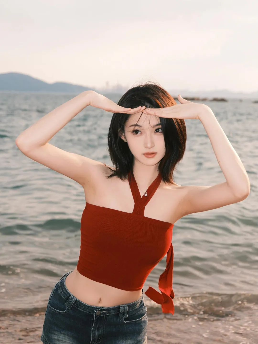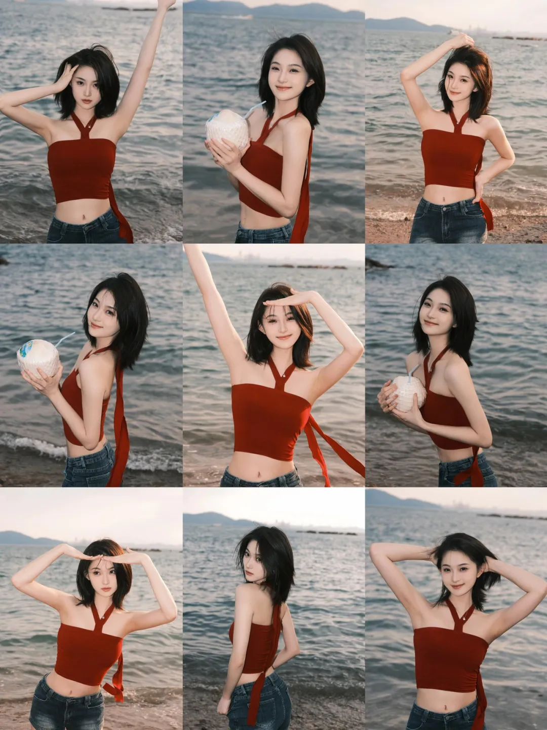 侧身对着镜头,微微仰头微笑,双手捧着椰子。这个动作既丰富了画面内容,又让肢体动作显得不单调,拍照时海水的蓝色为背景,与红色上衣形成色彩对比,拍出来的照片增加了画面的视觉冲击力。