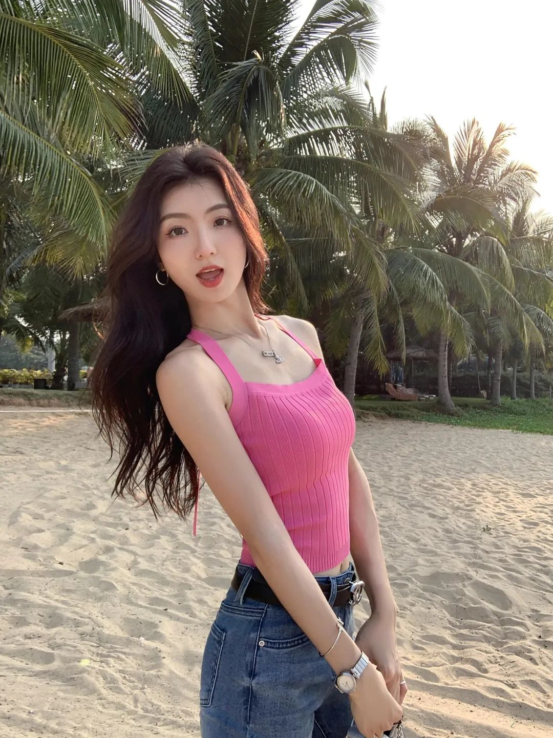 双腿交叉站立,双手叉腰面向镜头,姿态随性又自信。整体姿势与身后沙滩、椰树的休闲环境相契合,加上牛仔裤所带来的休闲气息,整个拍照画面充满了青春活力。