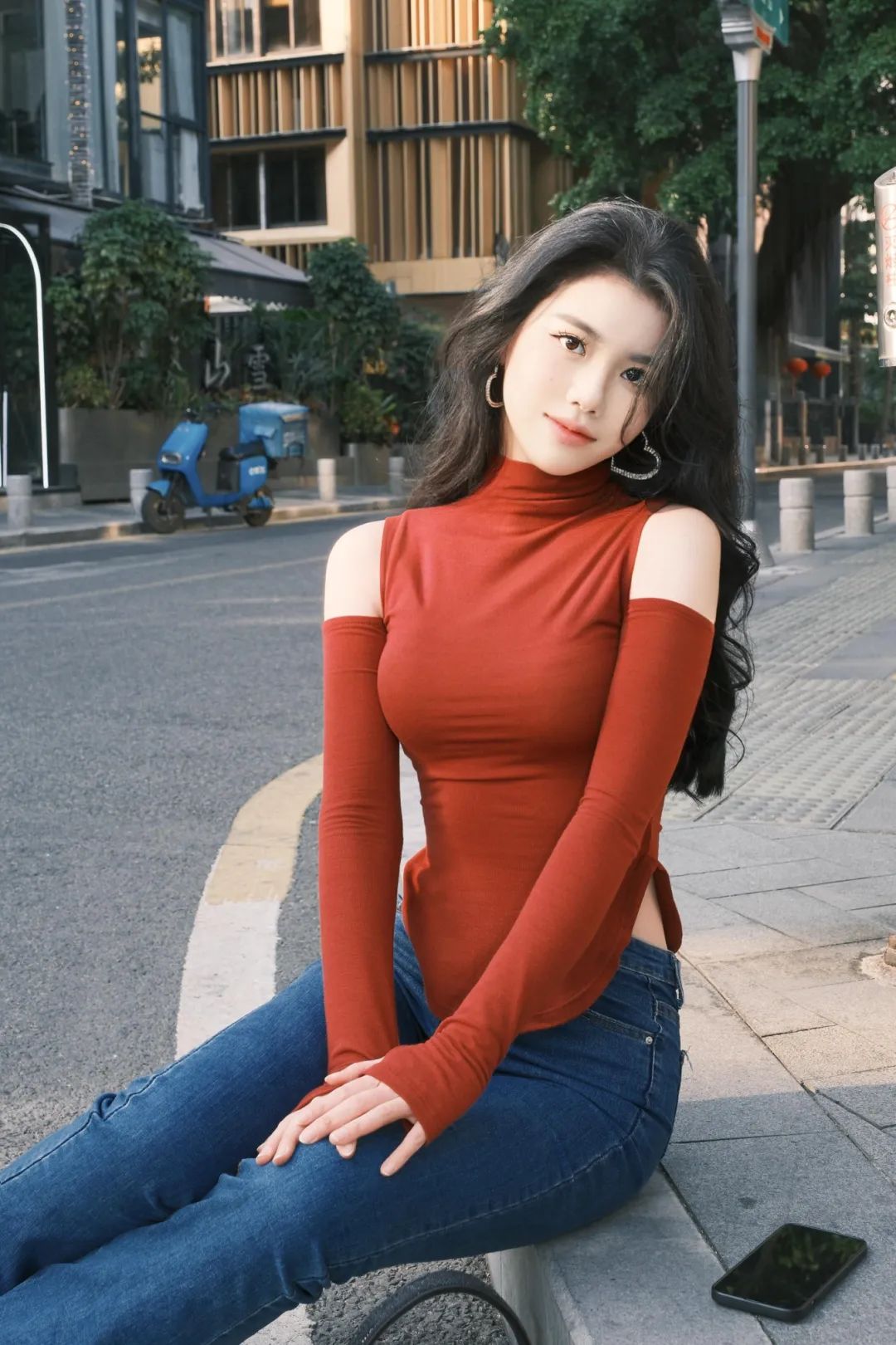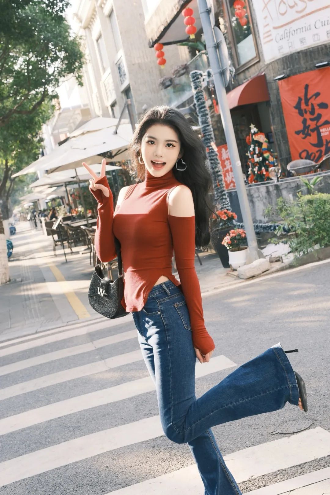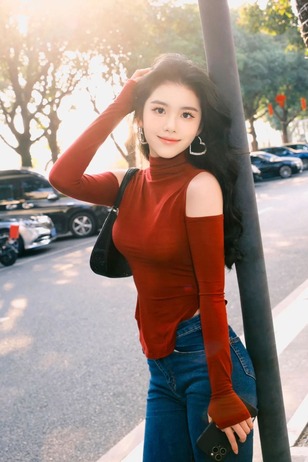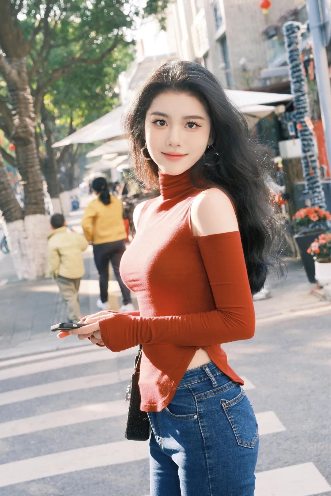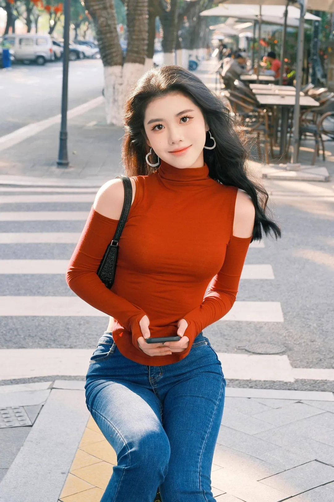 侧身回眸微笑面向镜头自然站立,双手自然拿手机,眼神直视镜头,这样的拍照姿势展现出自信和亲和力。露肩高领上衣搭配牛仔裤,让整体拍照时尚且具有个性,为拍照画面加分。